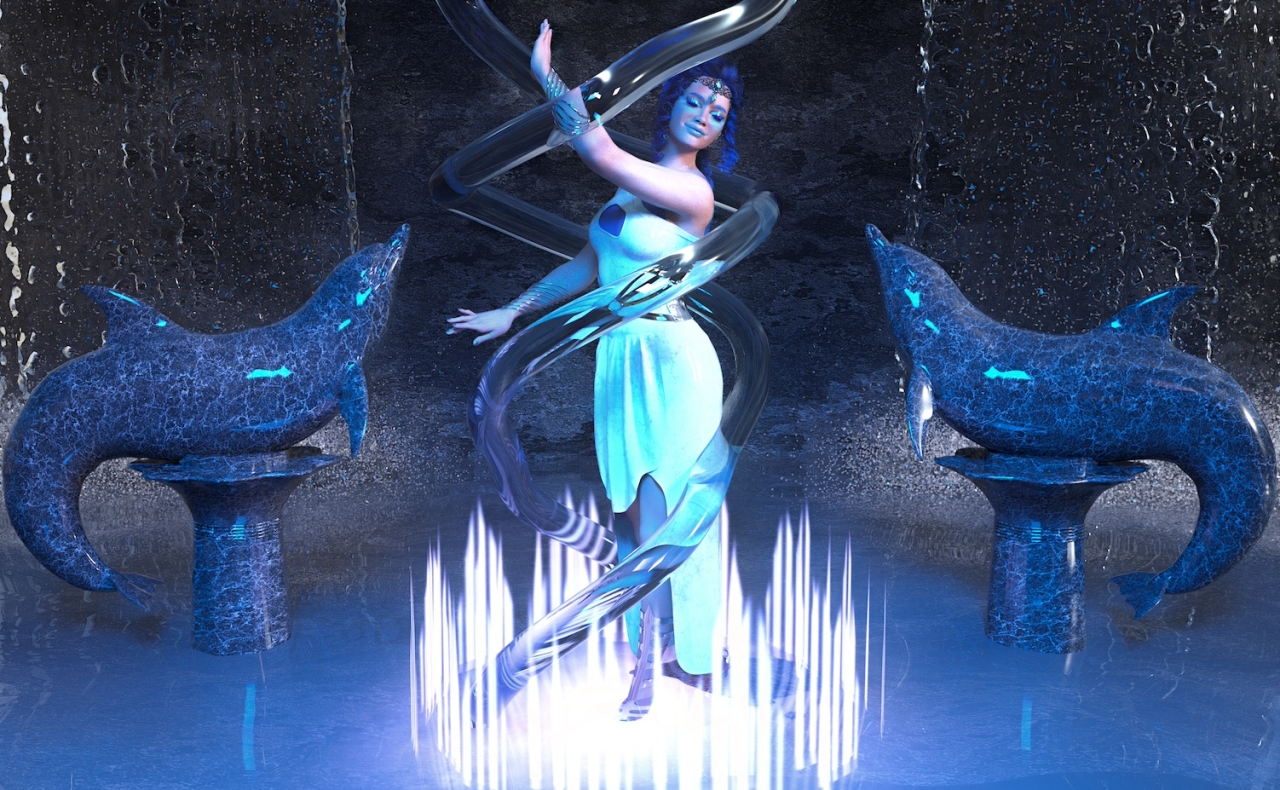 A beautiful enchantress dances in the pool, weaving water magic as she gracefully moves her arms.