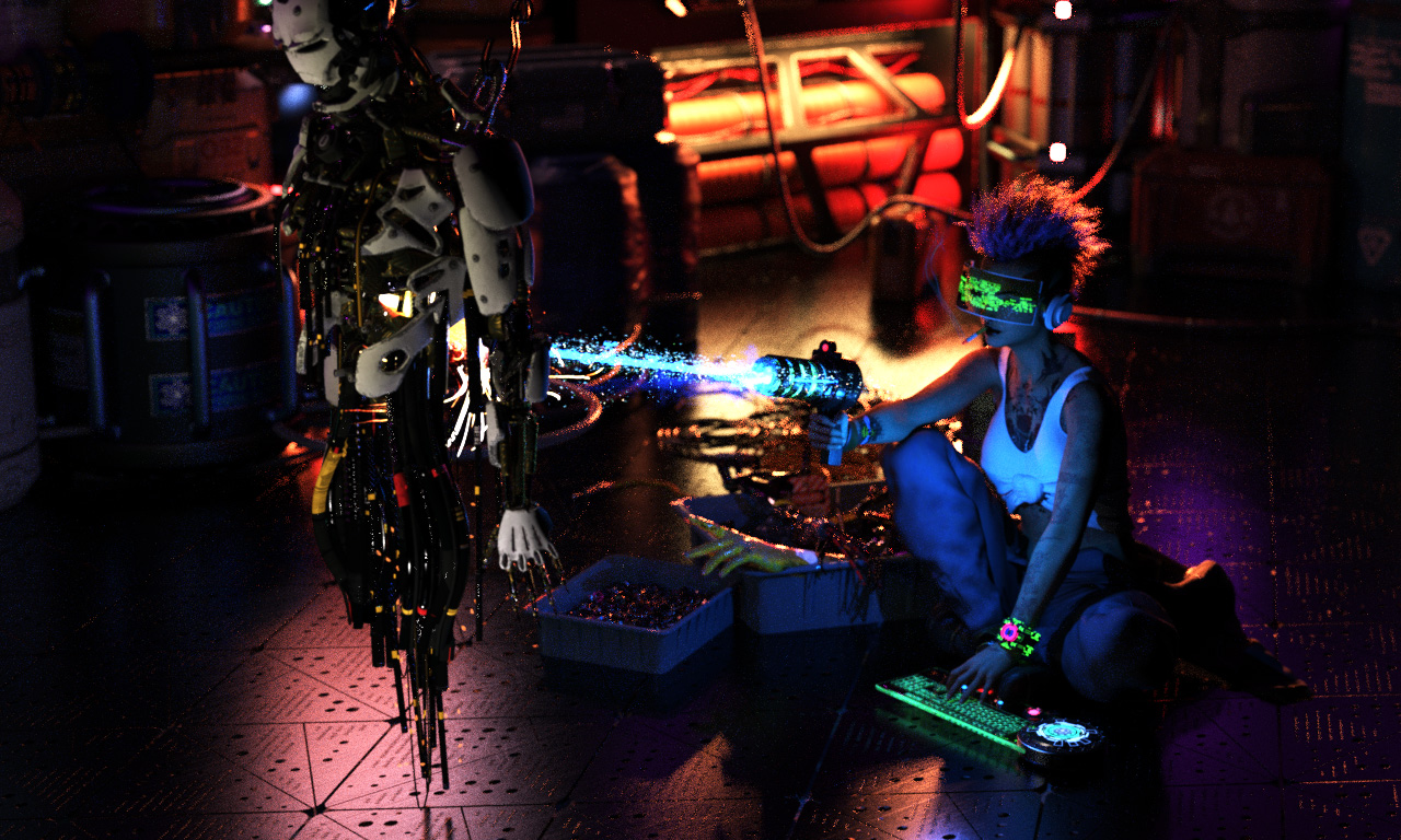 A sci-fi mechanic uses her trusty MagPulse Helios™ (a welding torch that uses precise magnetic fields to direct pulses of plasma) to rebuild a bot that's seen better days.