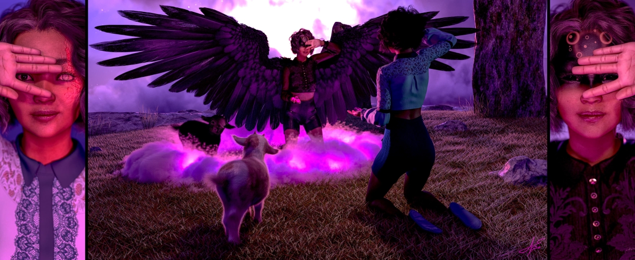 Dual themes of "fantasy" and "true form". Featuring Sade3d's "dForce Imola for Genesis 8 Females" and Hypertaf's "Popcorn the Goat".