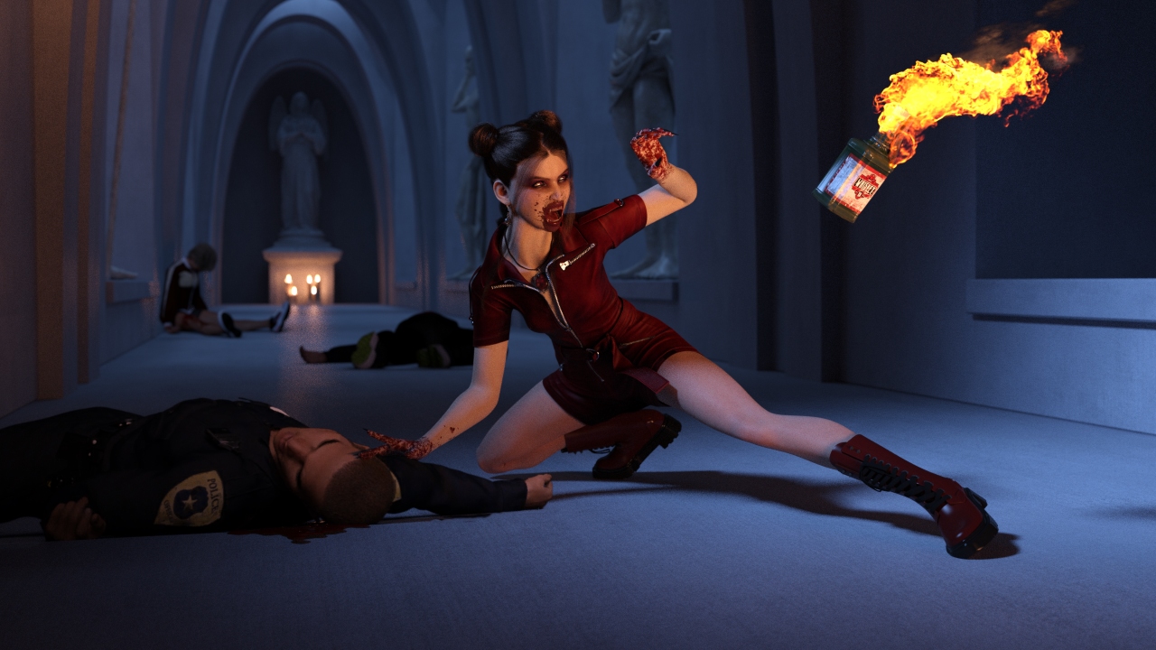 This is really superb work! We catch the gaze of this feral vampire right at the instant where she understands the tides has turned. We can mentally reconstruct the full action, with the bodies in the distance, yet the picture does not feel crowded. The pose is very dynamic. It is beautifully lit and makes great use of depth of field. And of course, that flaming bottle is a brilliant idea!