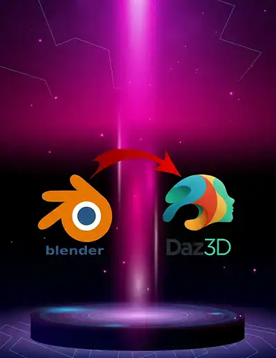 • Neon-style 3D software transfer between Blender and Daz Studio with futuristic aesthetic.