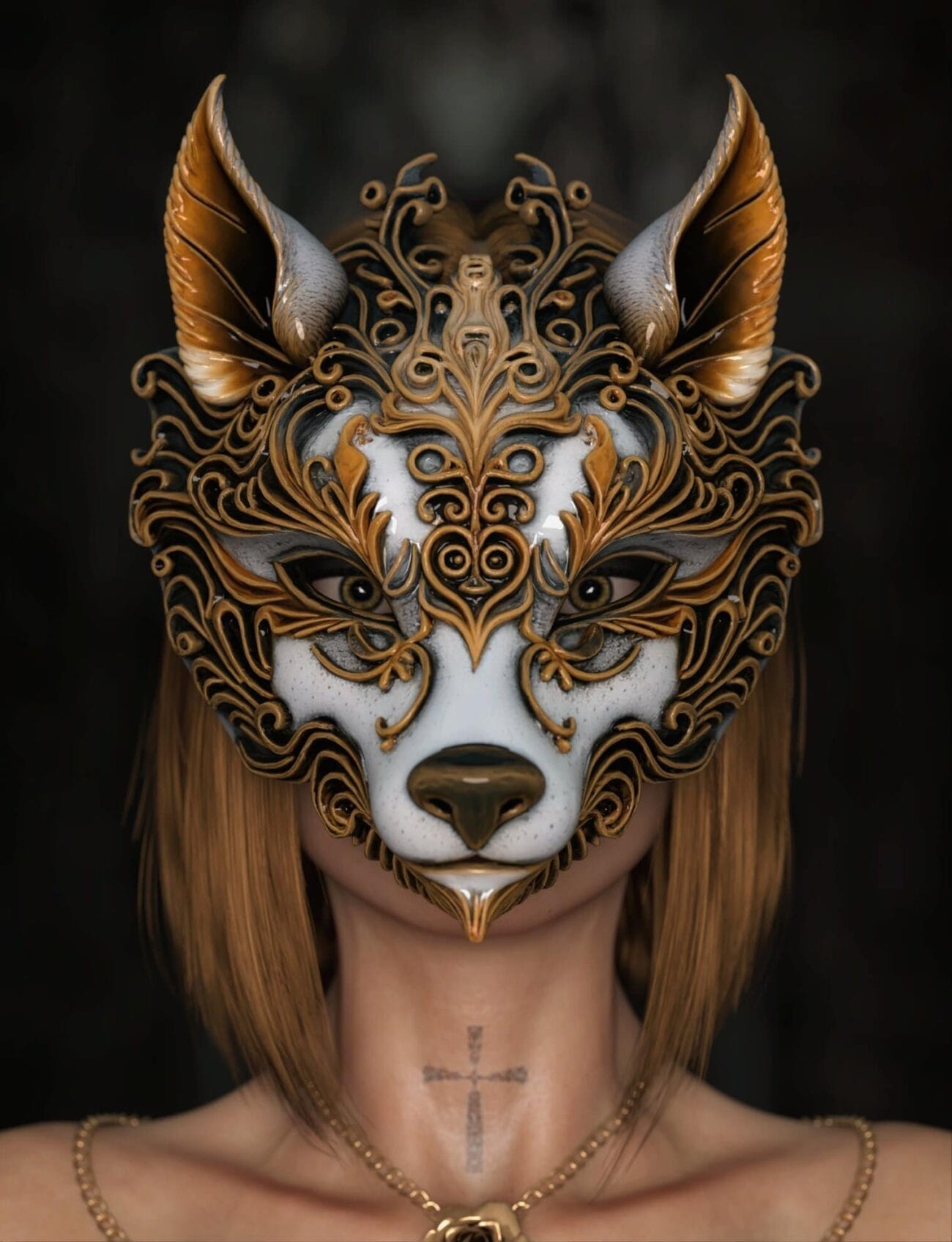 Intricate animal-themed mask with gold and black details worn by a woman with a cross tattoo on her neck, showcasing artistic 3D design and high-quality Daz3D assets.