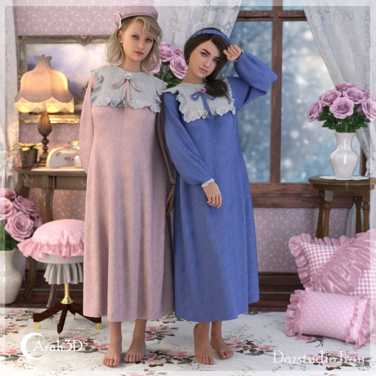 Clothing set for Genesis 8 Female that includes a d-force-ready dress, a d-force ready bow, a hat, headband, and earrings.