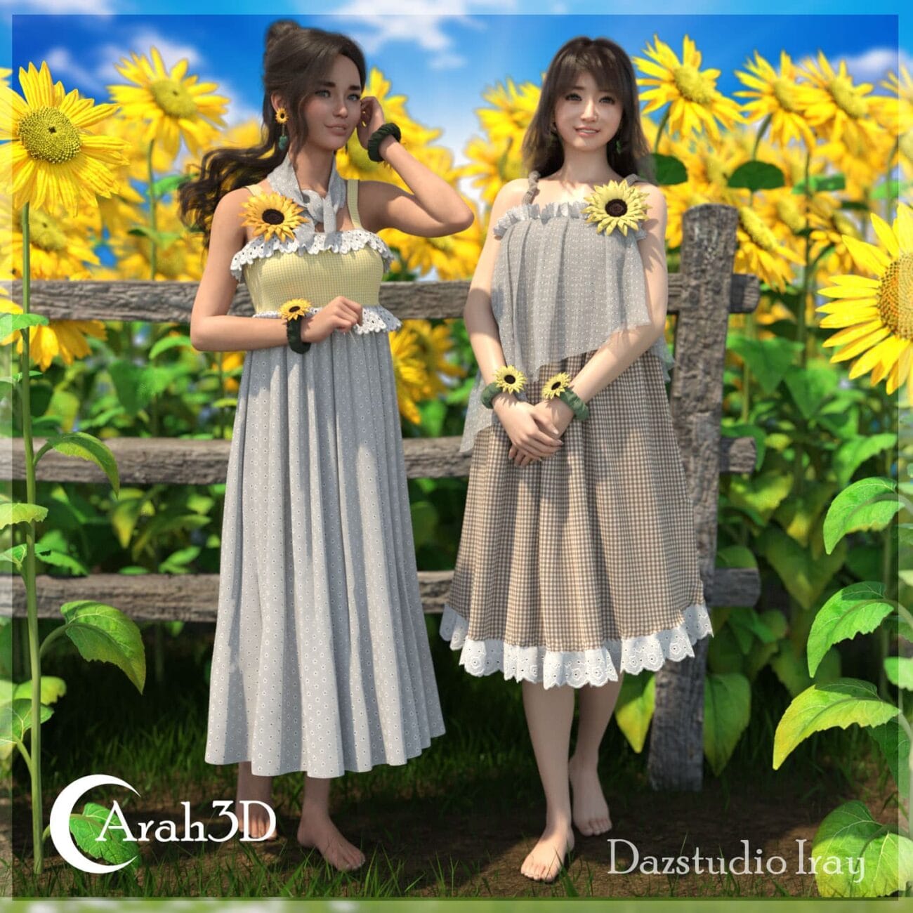 This is a high-quality clothing set that includes 2 d-force-ready dresses and a d-force-ready scarf. With prop scrunchie bracelets, earrings, and parented sunflowers.