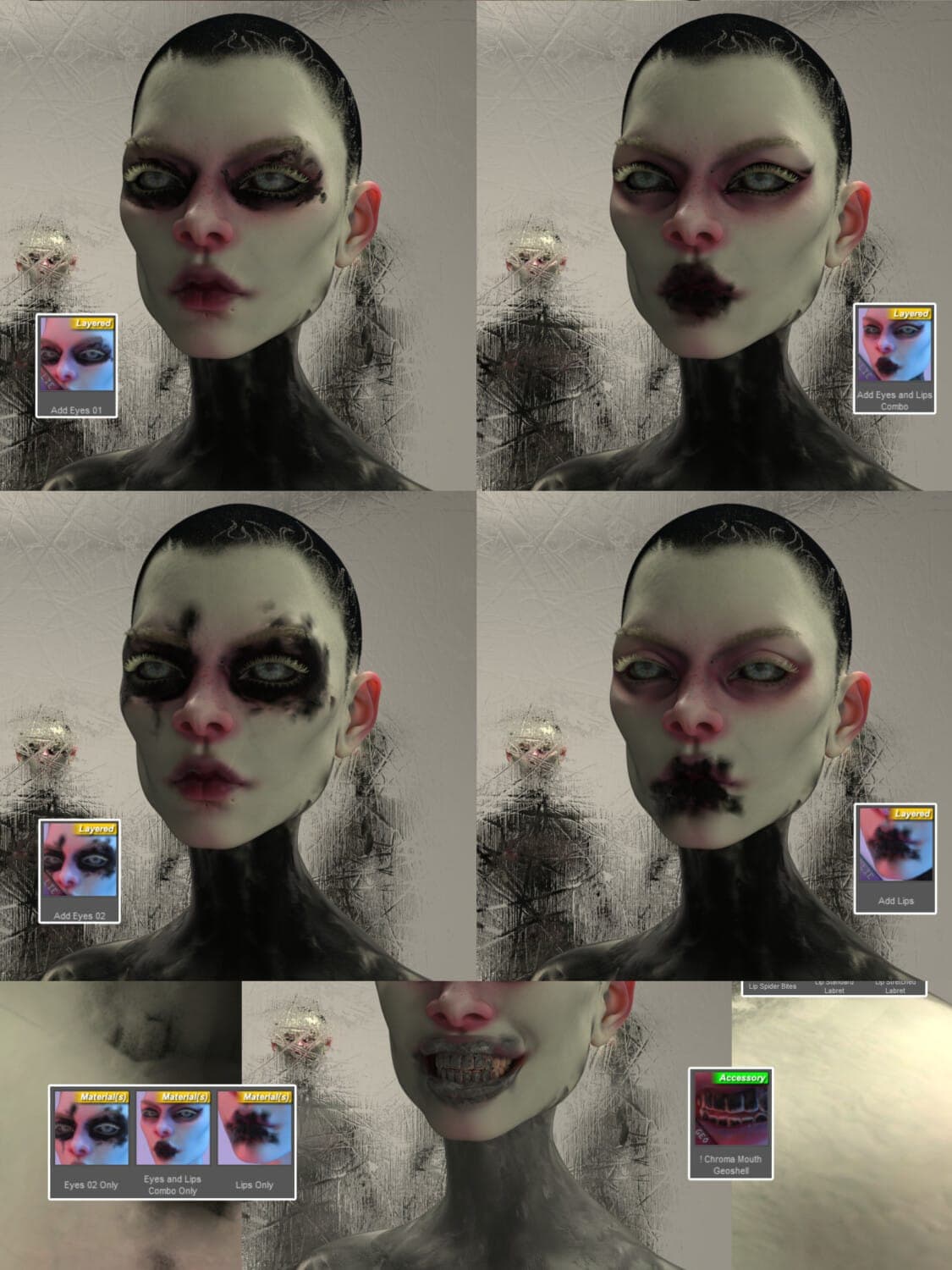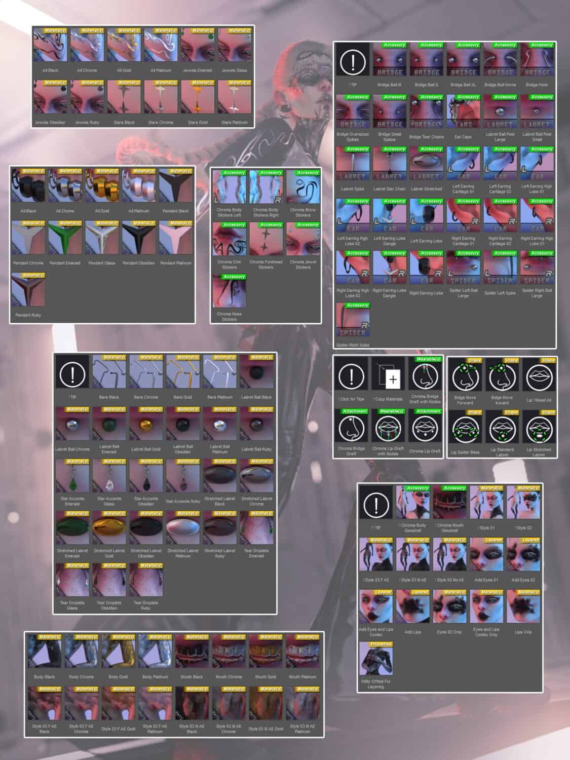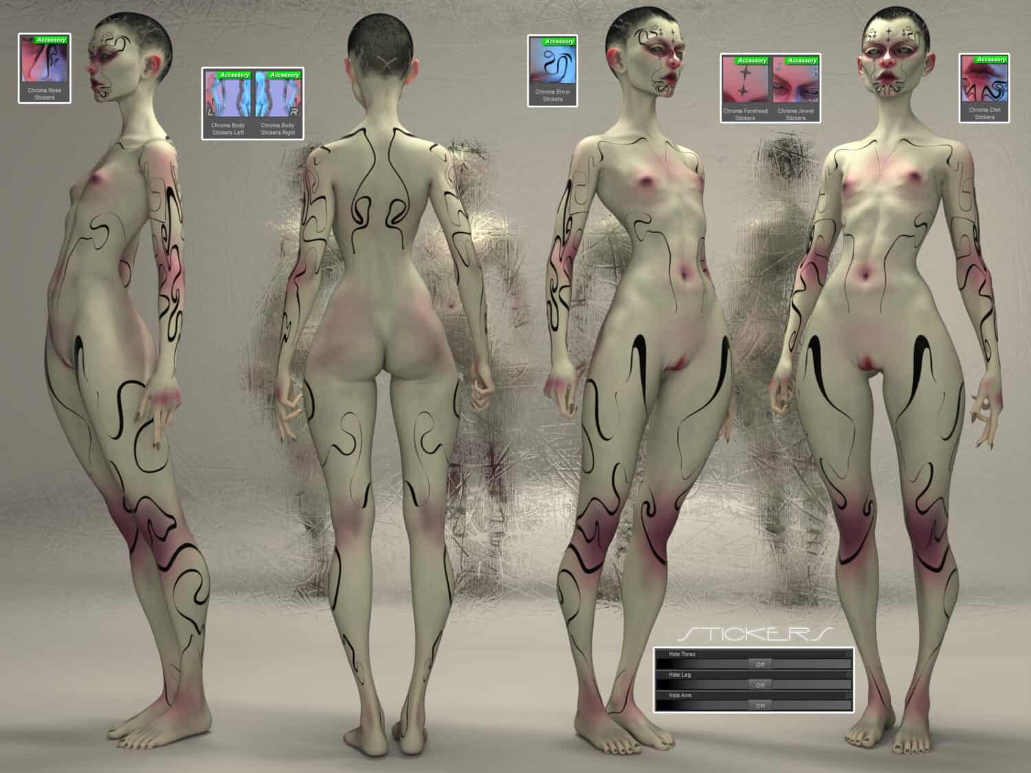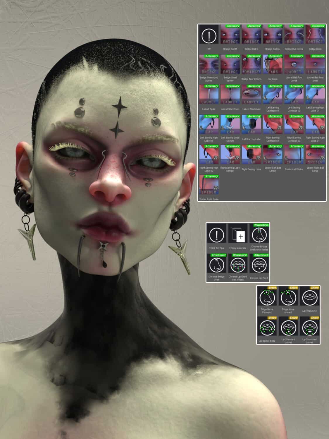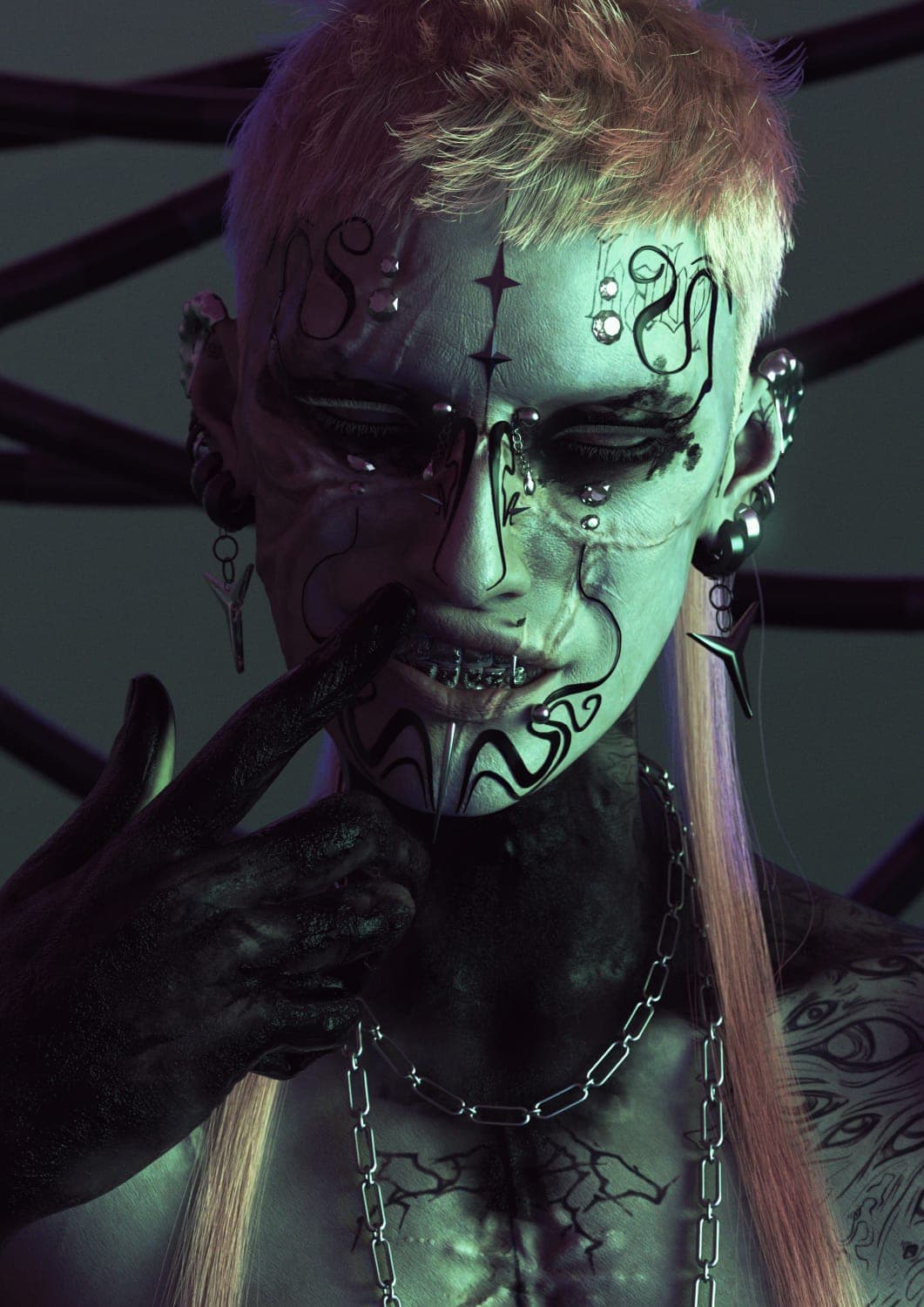 Take a trip to the abstract dark side. Whether it’s battle paint, a rave, or music video, slather some thick, chunky body paint on your G9 models and add some metallic stickers for good measure. That’s not enough for you? The Chroma Set comes with a small pile of facial piercings and earrings to make sure your models stand out against the crowd.
