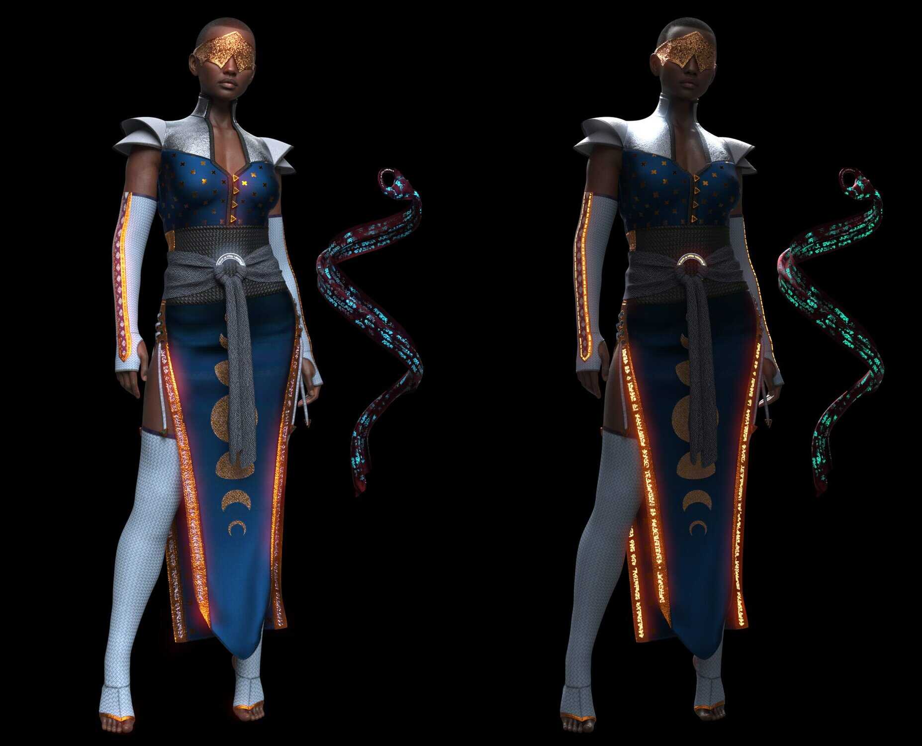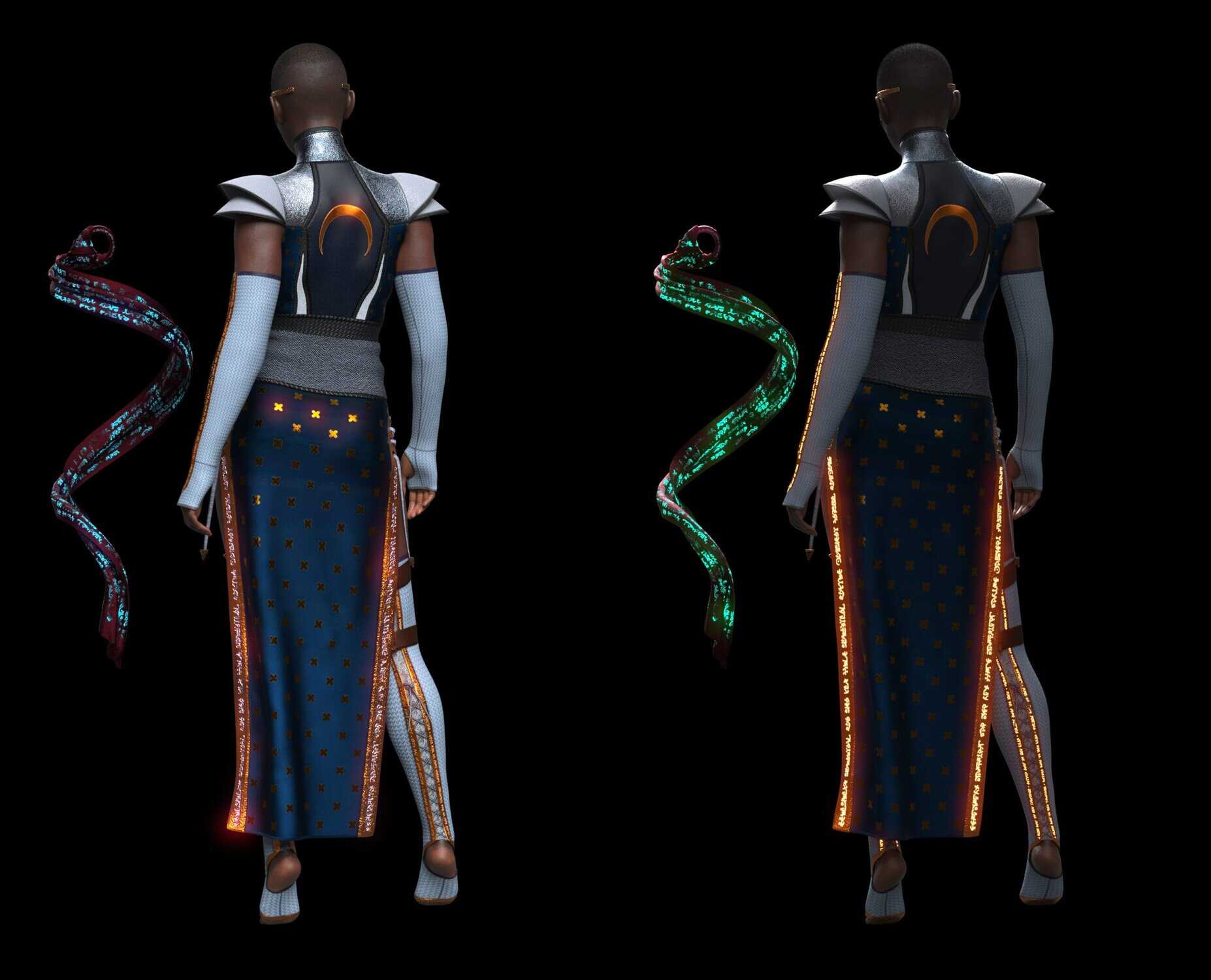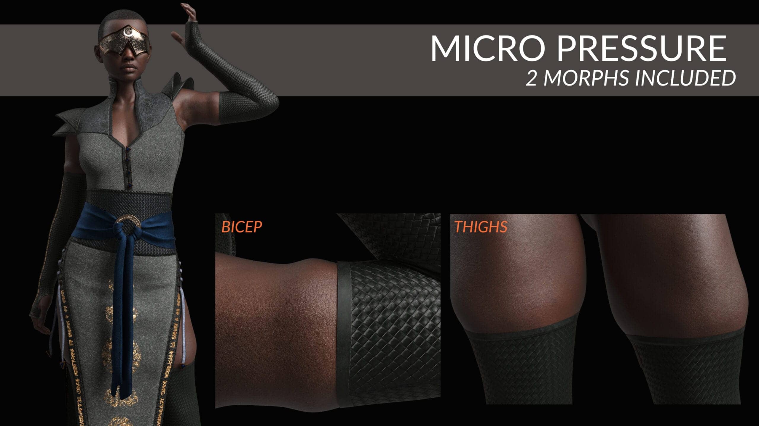 This outfit set contains 2 micro-pressure sections, 1 on the bicep at the end of the gloves and 1 on the thigh at the end of the Footwraps. The micro-pressure can be adjusted either by using the slider in parameters or by using the ready made buttons that will set it to 0%, 50%, or 100%. The text on the skirt, metal ring, gloves, and footwraps have emissive maps to have them light up. These can be enabled with the provided buttons and for further editing use the surfaces section!