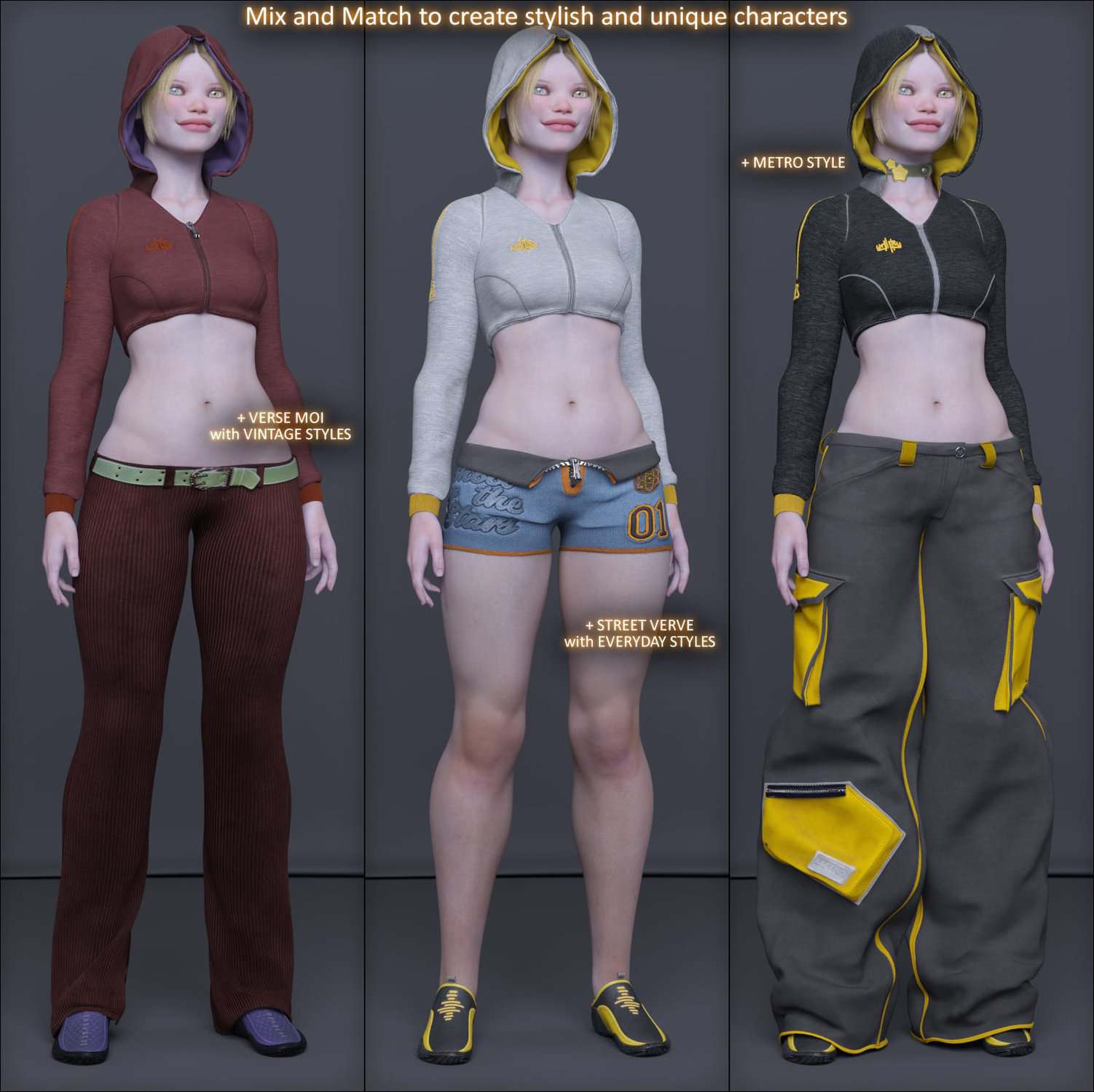 This product includes the full dB gray and black cotton styles (as shown in the promo images). The styles are fully PBR (roughness-metal); they look great from a distance and amazing from up close! They match the high-quality of any Aeon Soul styles and can easily be mixed and matched with any similarly thematic piece from the Aeon Soul’s wardrobe.