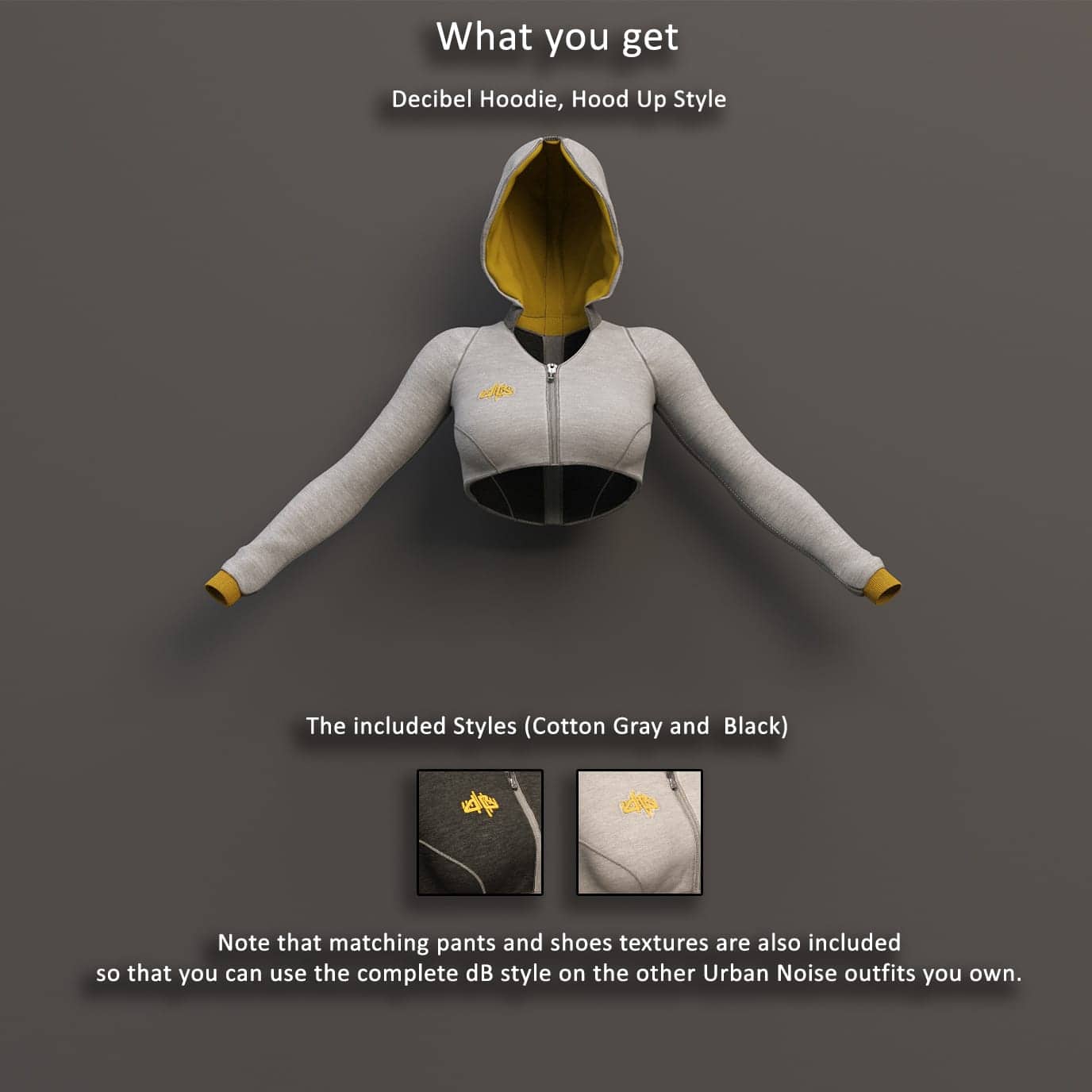 It can easily be mixed and matched with other Urban Noise sets, such as Hz and FM, and in fact it also includes matching textures for pants and shoes so that if you own previous released Urban Noise you can use the full dB style on all your clothing.