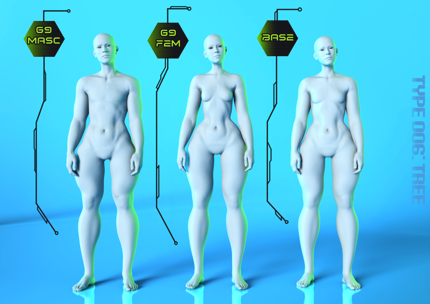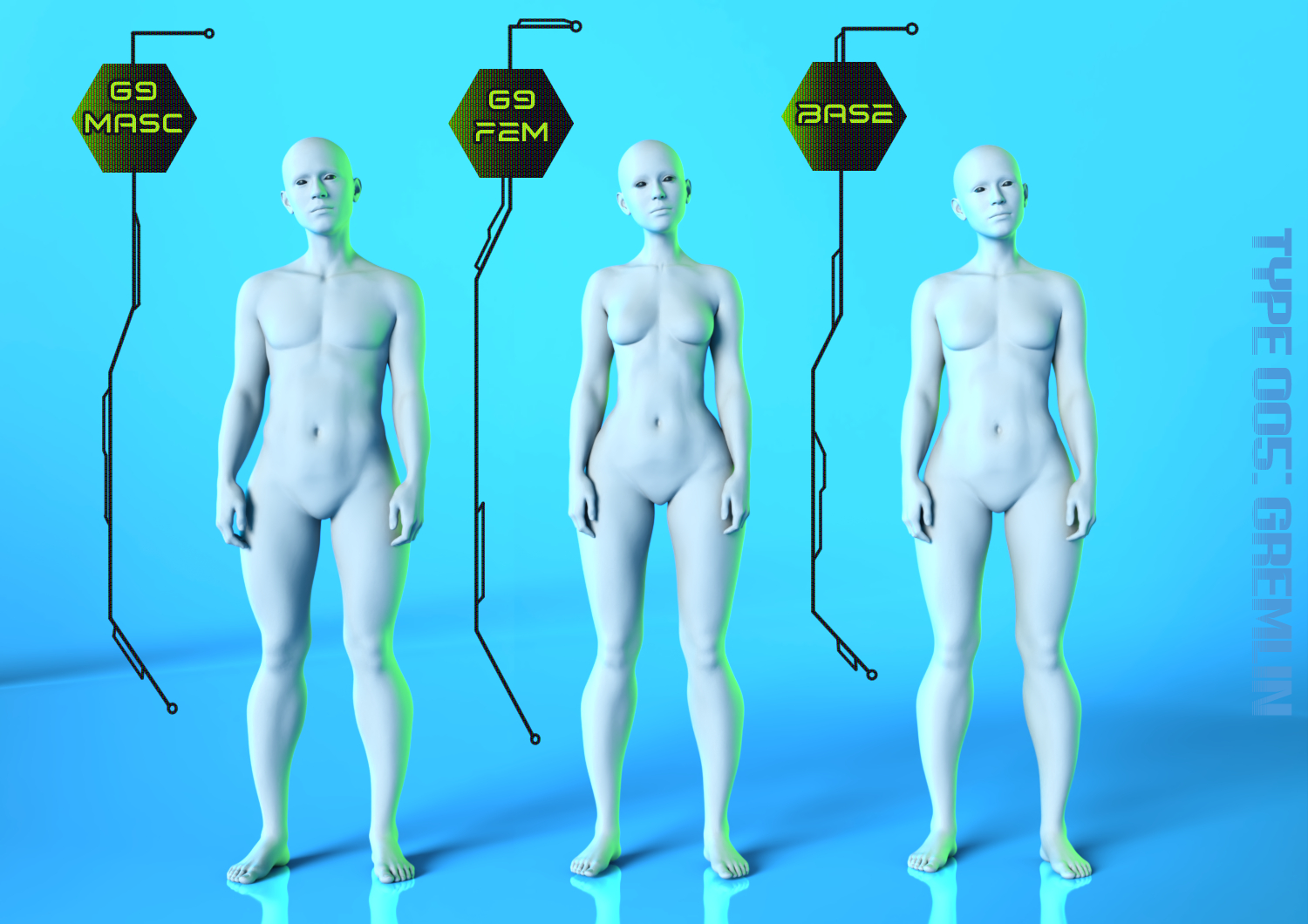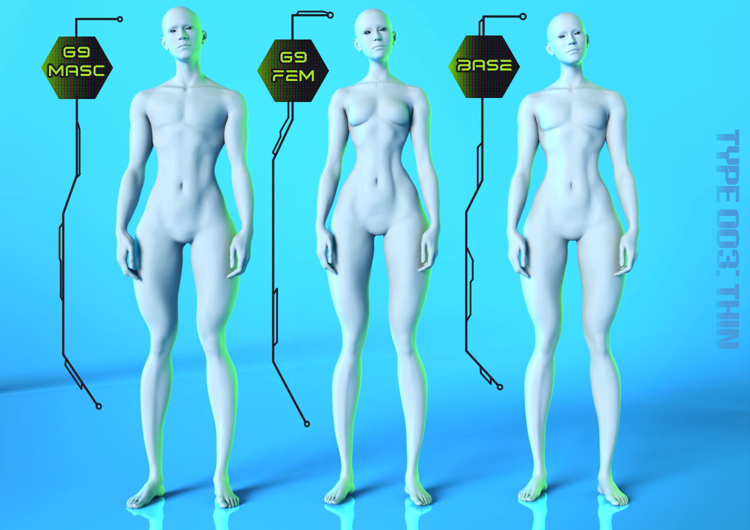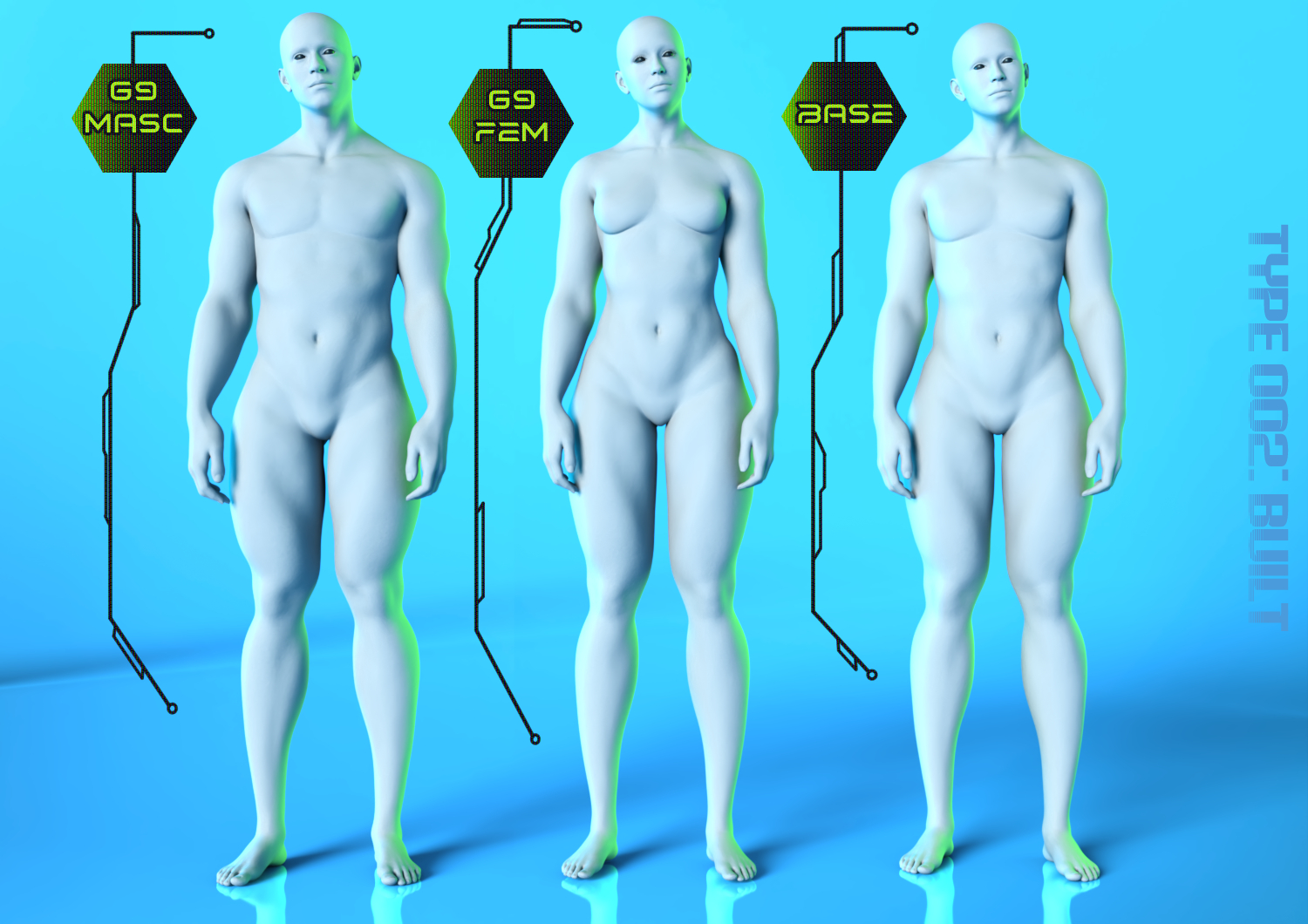 Gliched Body Shapes are a set of 6 morph dials with elongated limbs, broad shoulders, and overall odd proportions that act as bases to build your own stylized characters. Use one of the 18 included presets to