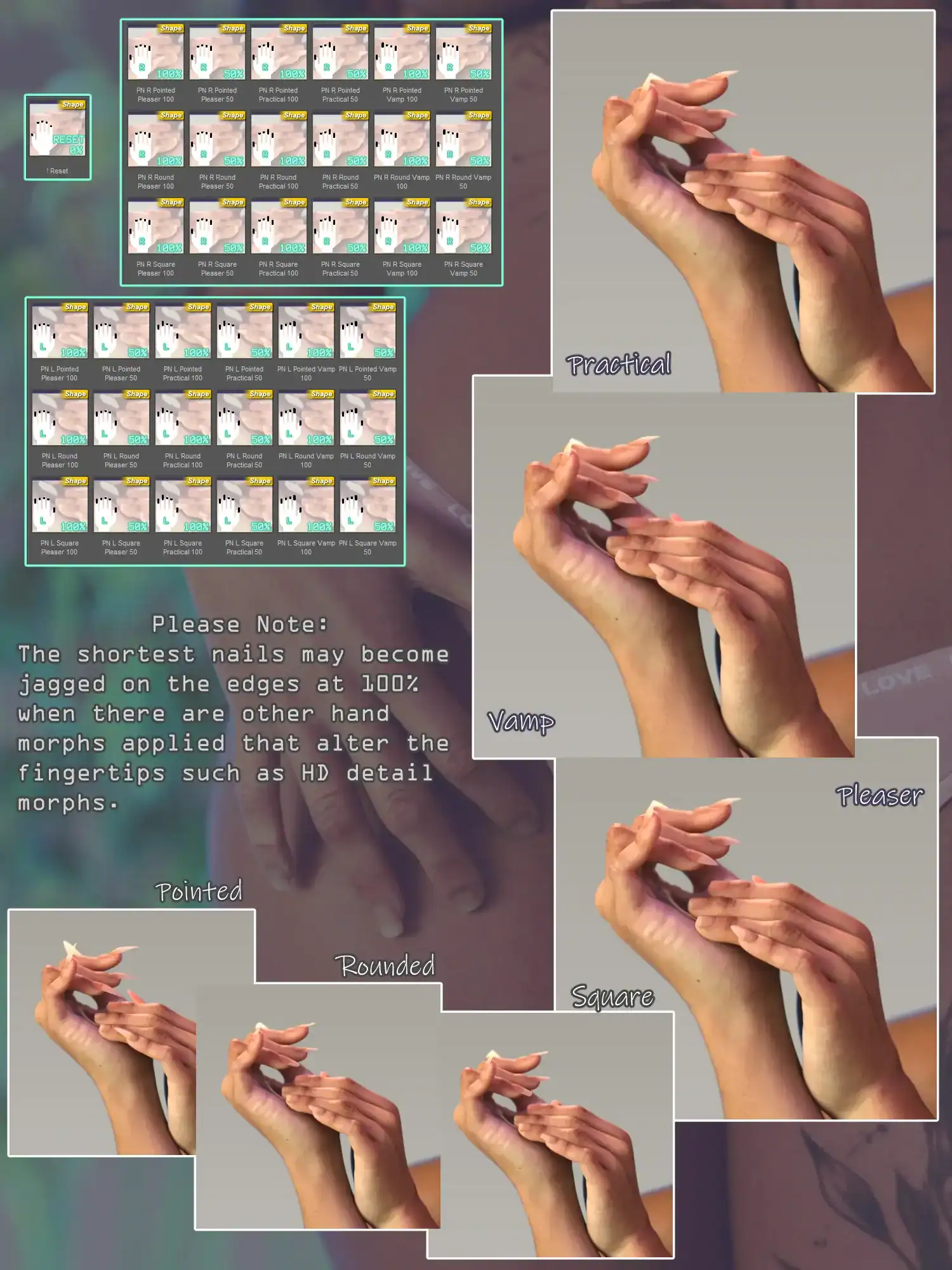When dialed to 100%, you may notice so warping or jagged edges on the short nail tips. This can be caused by certain hand shapes or HD detail morphs that alter the fingertip or nail itself.