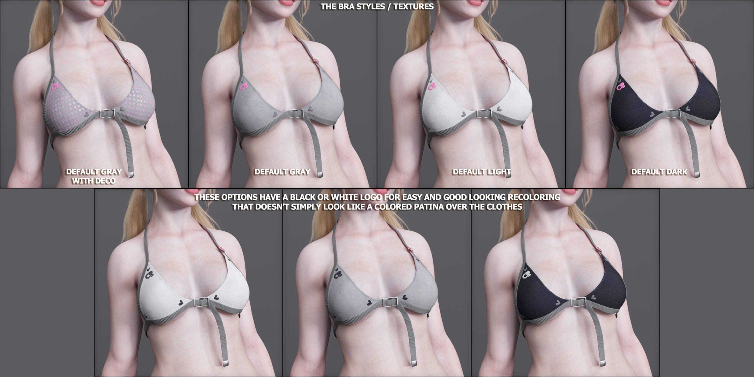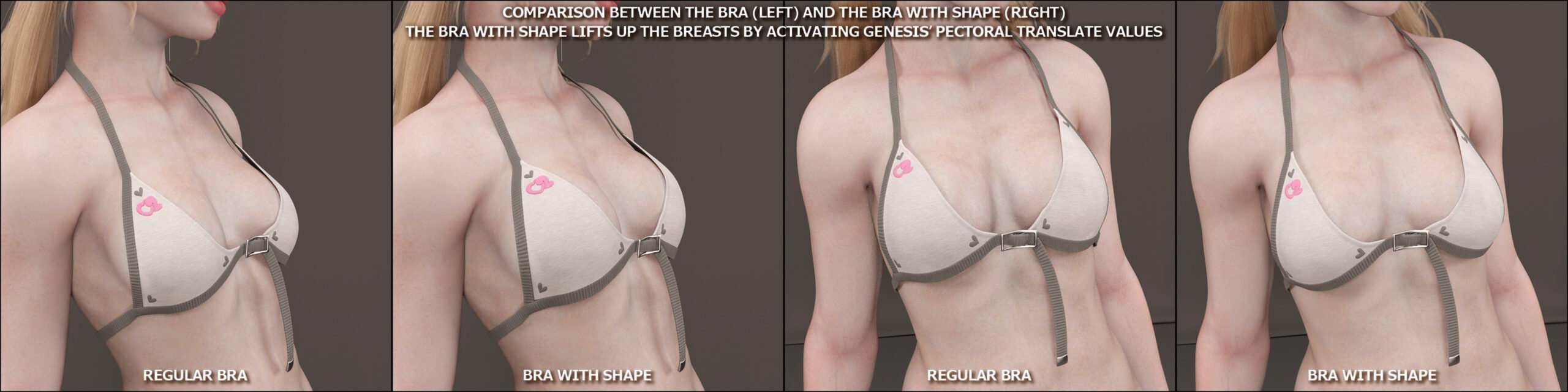 The Bra is a not-so-classic triangle bra, featuring a small front buckle and a hanging strap that can be easily moved or hidden, depending on your preferred style. It has thickness and structure, giving it a realistic and solid appearance. The Bra is not dForce compatible.