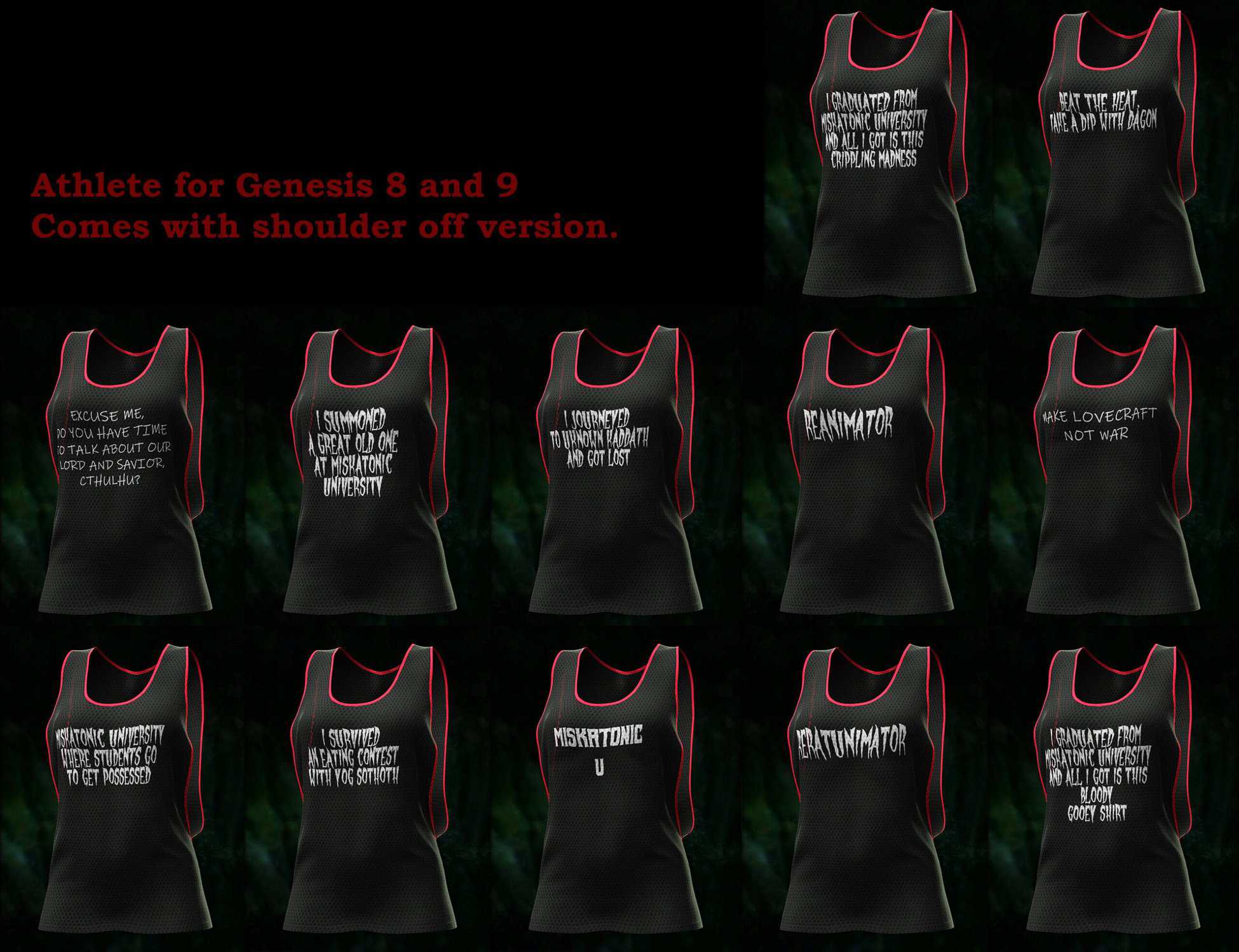 - The Cultist Gym Top: A wearable Gym Top for Genesis 8 and 9 figures comes with 12 hilarious, Cthulhu-themed slogans for the ultimate Lovecraftian enthusiast. Favorites include: