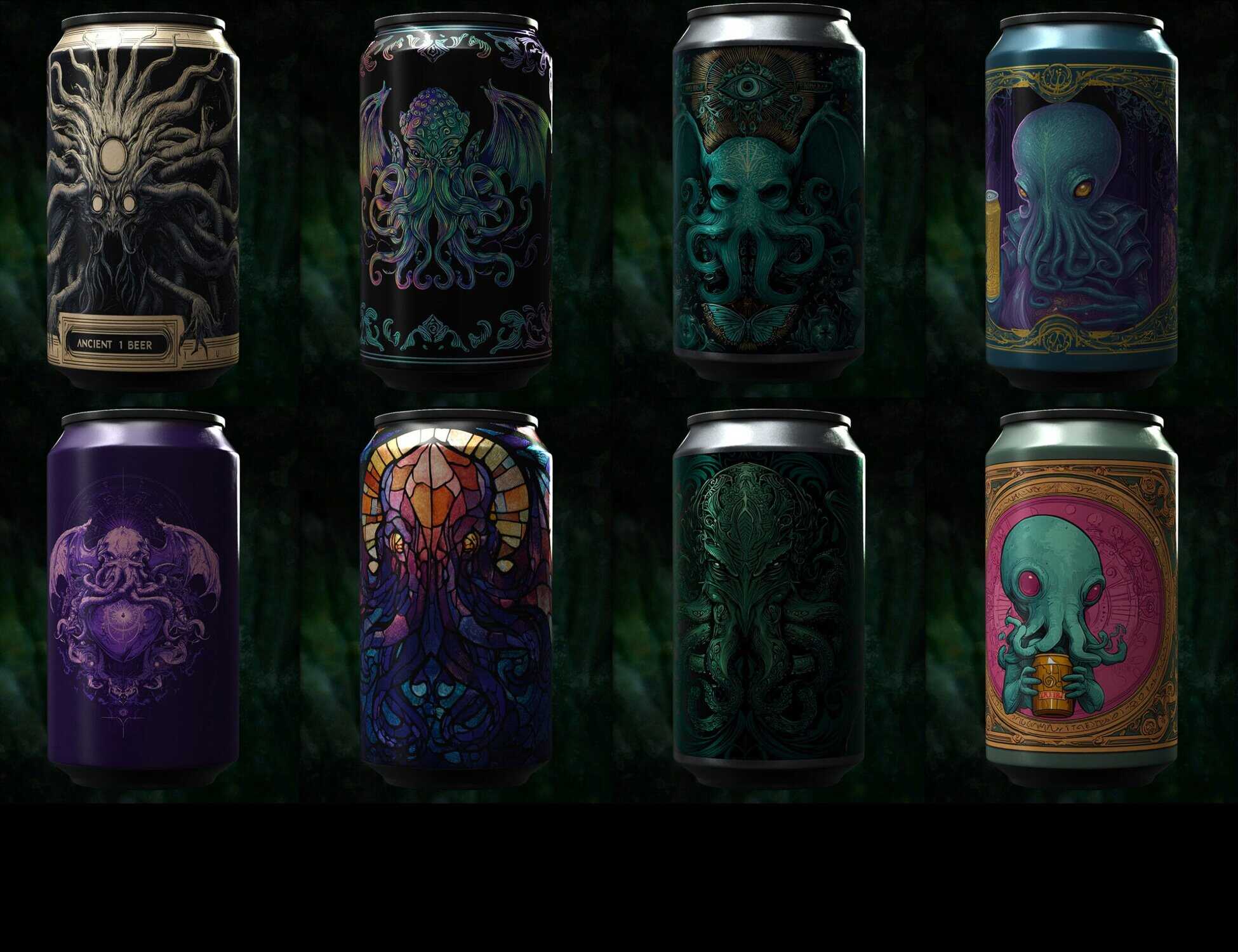 - Canned “Ancient Beer”: Eight distinct, gorgeously-labeled Soda Cans feature stunning, custom cosmic-horror-themed artwork—perfect for a cultist’s fridge!