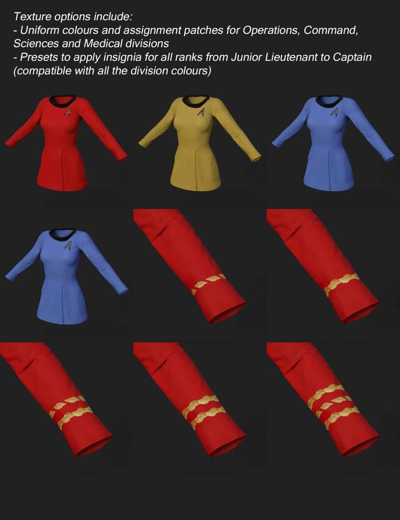 The add-on includes a custom shaping preset/morph to give the dress the wide neckline of the original, texture sets for the Operations, Command, Sciences and Medical Divisions, and layered image overlays for sleeve insignia between the ranks of Junior Lieutenant and Captain.