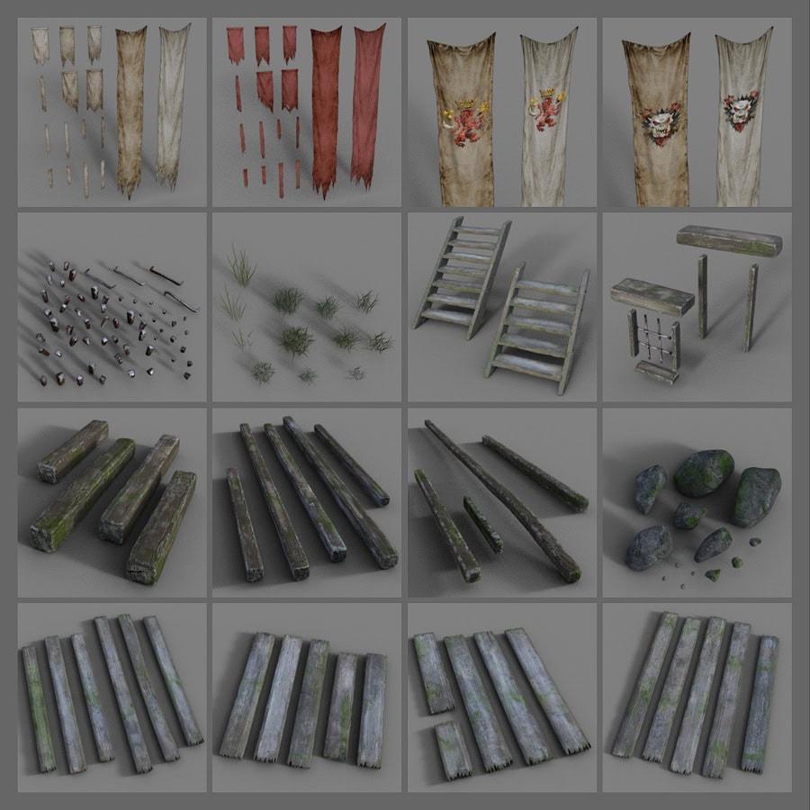 This product contains various worn and weathered kitbash elements: an ample amount of wooden planks, beams, rocks and boulders, a collection of grass clumps and a nice selection of hanging rags and flags with