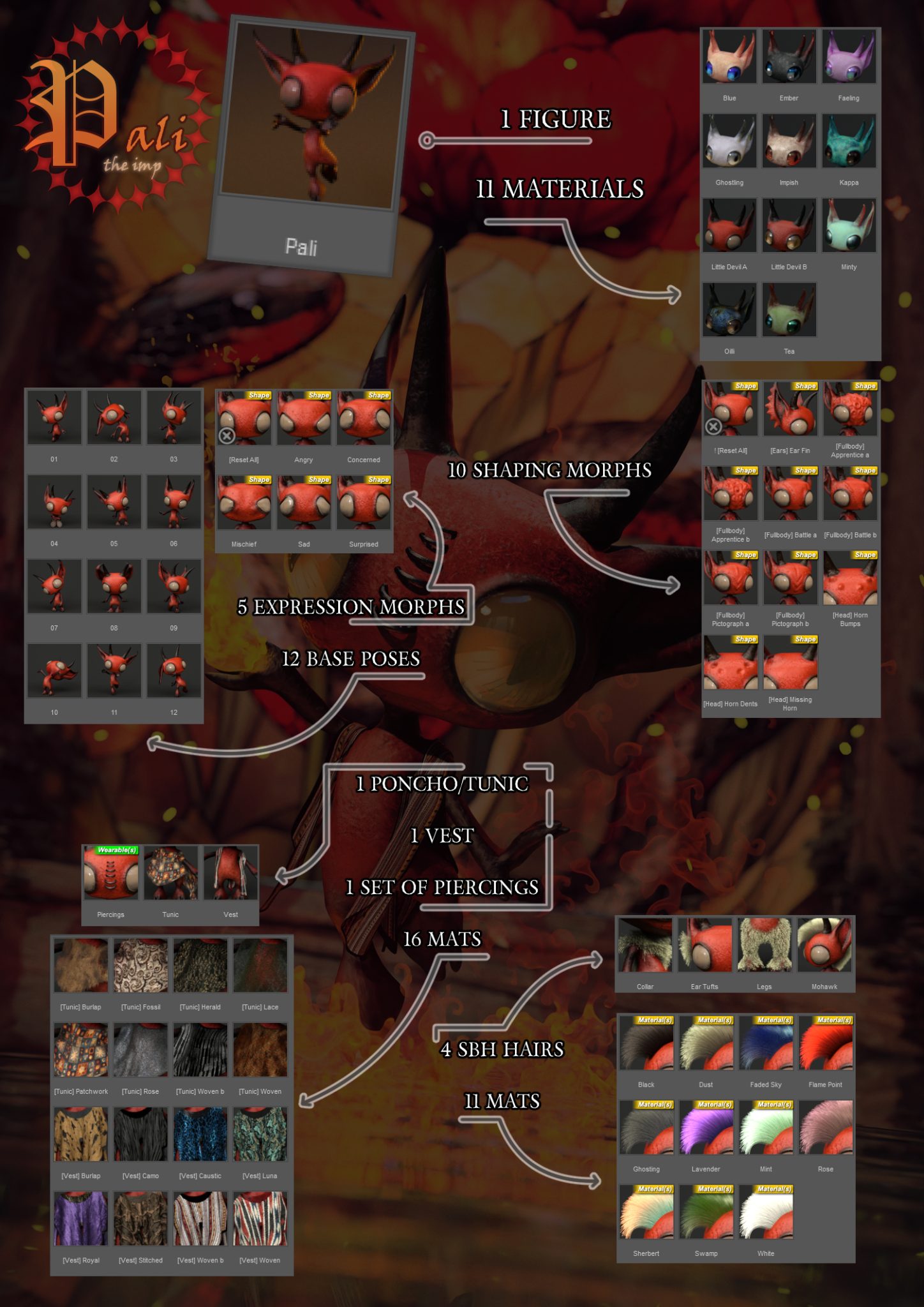 Pali the Imp is a tiny standalone figure for daz3D who’s favorite pastimes are dancing and attempting arson. They’ve packed their bags and are ready to burrow into your runtime.