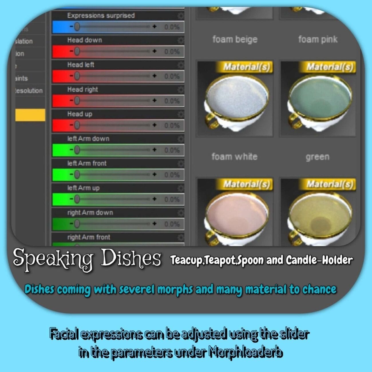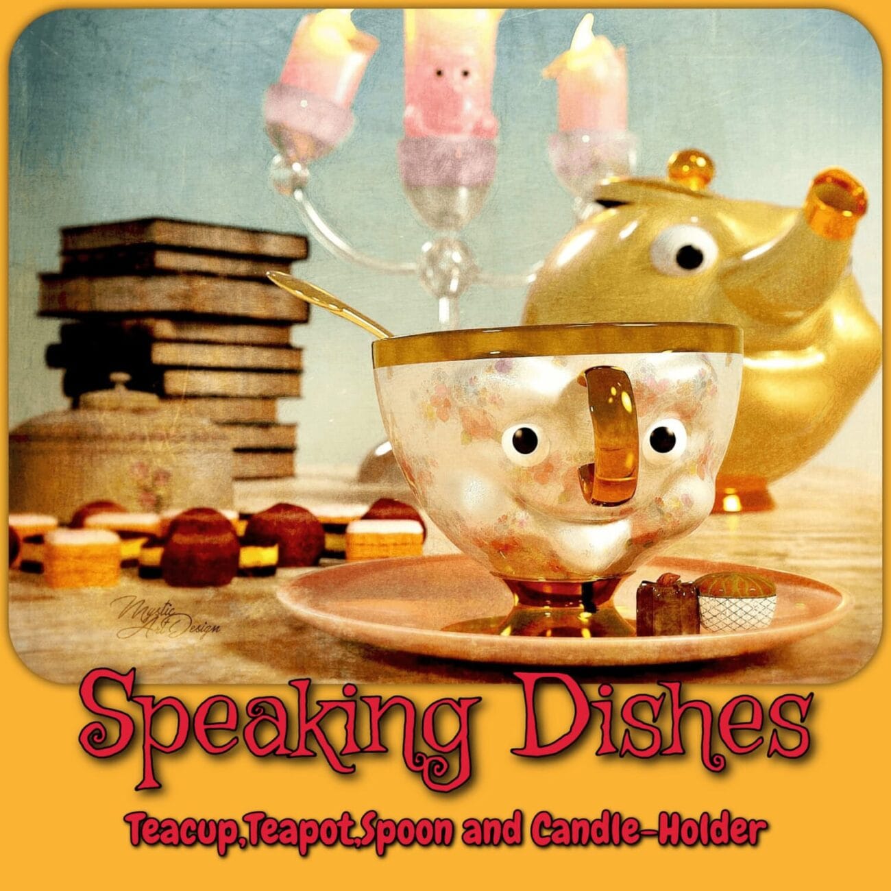 My latest release is the “Speaking Dishes”, as seen in “Beauty and the Beast”. You’ve probably already seen it in various renders of mine. I’ve finally managed to wrap it up for you guys. You don’t have to explain much with the many promos. The lovingly designed toony props are equipped with facial expression morphs and each has many materials to transform it. Have fun with the funny “Speaking Dishes”