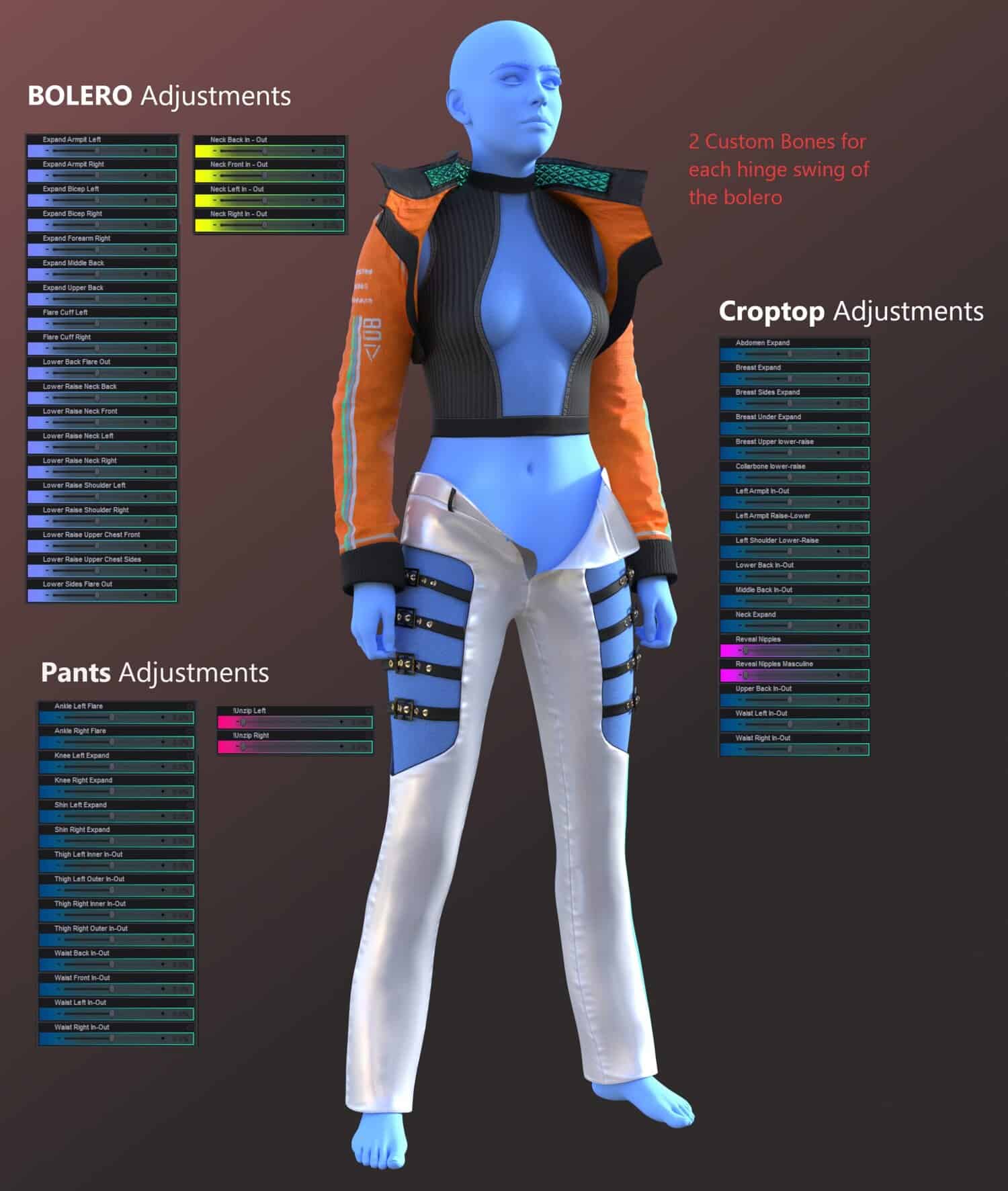 This outfit set contains 4 Additional Bones to control the front of the Bolero vest to open and close it (2 Bones for each side). Due to the Bolero having a high collar, there is a high chance of poke-through when posing the head and neck (especially Neck 1). Additional morphs have been provided to control the collar of the bolero in each direction.