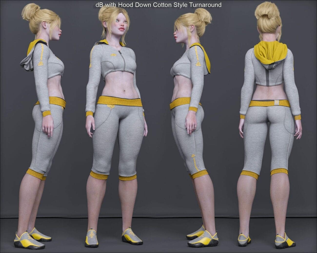 Urban Noise dB includes a stylish Short Hoodie with long sleeves, 3/4 comfy Pants with their waistband folded out and barefoot Shoes. It includes both Genesis 8 female and Genesis 9 versions.