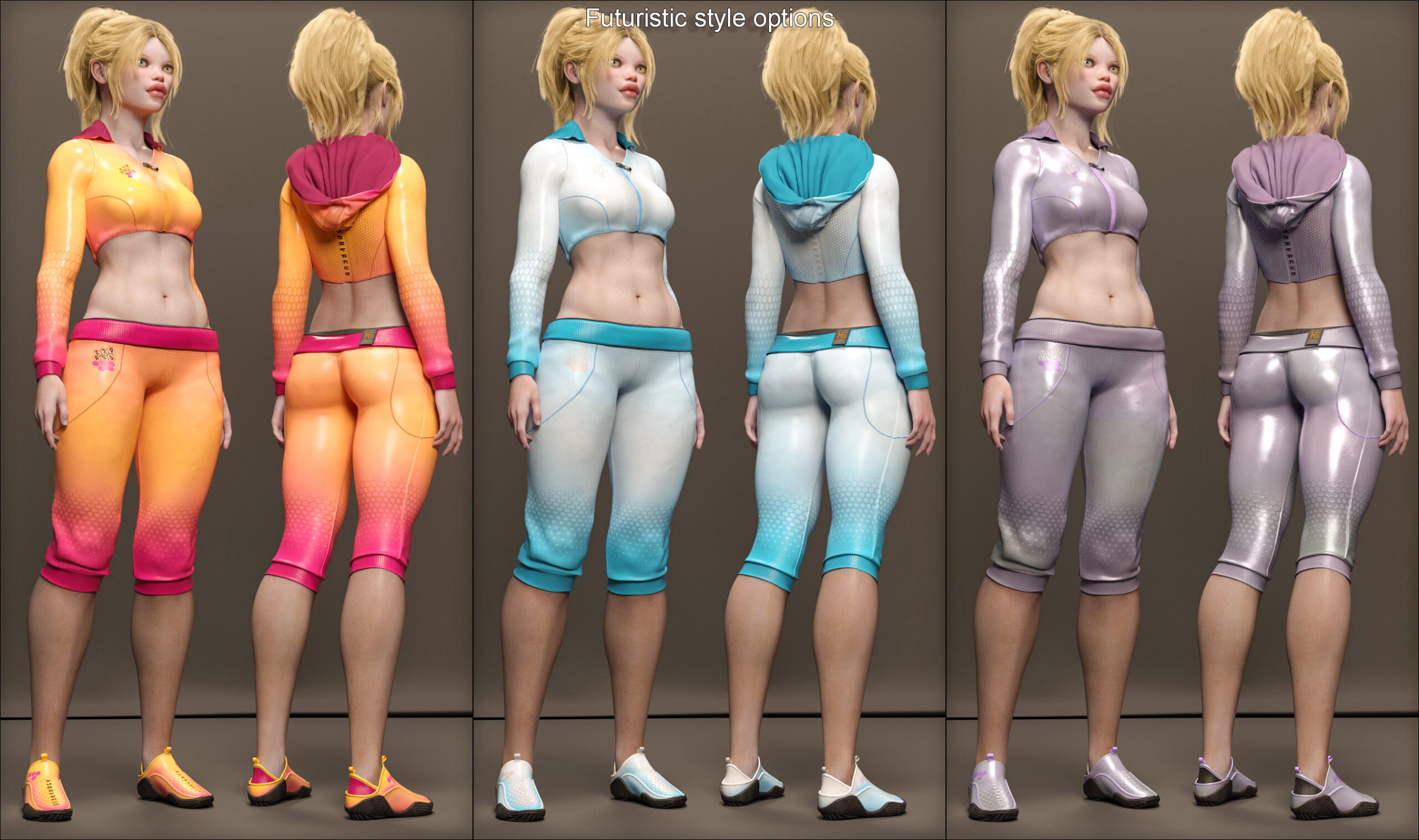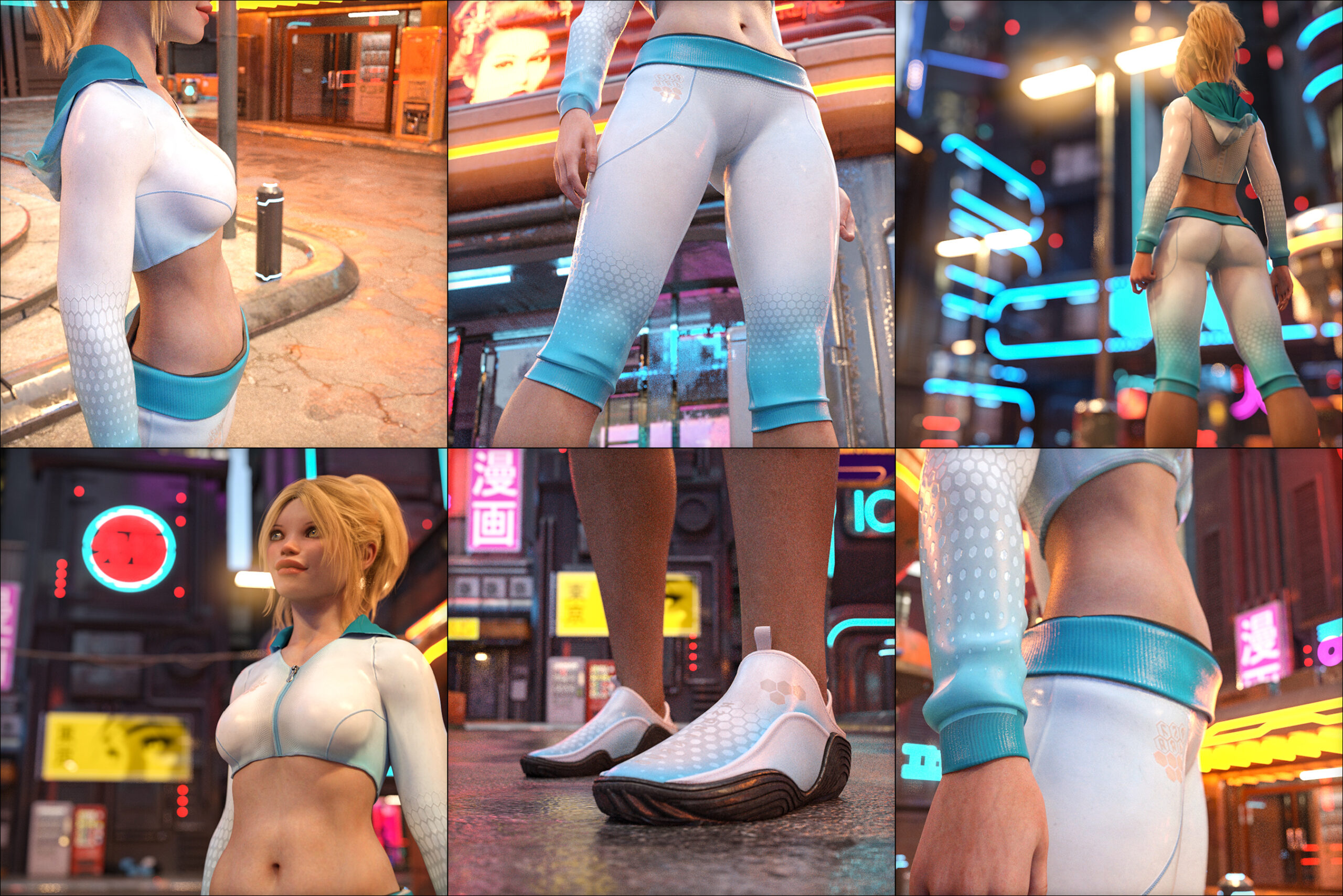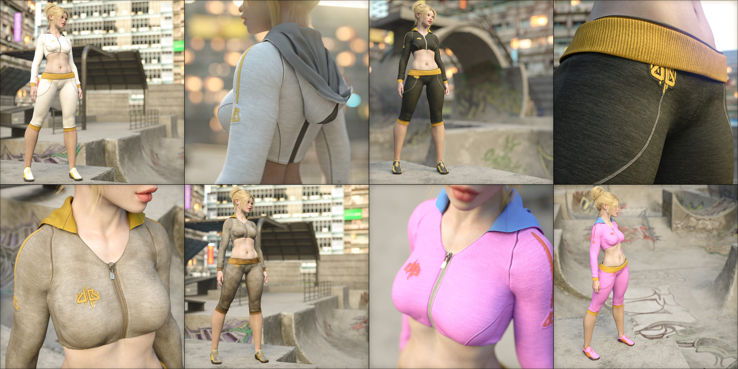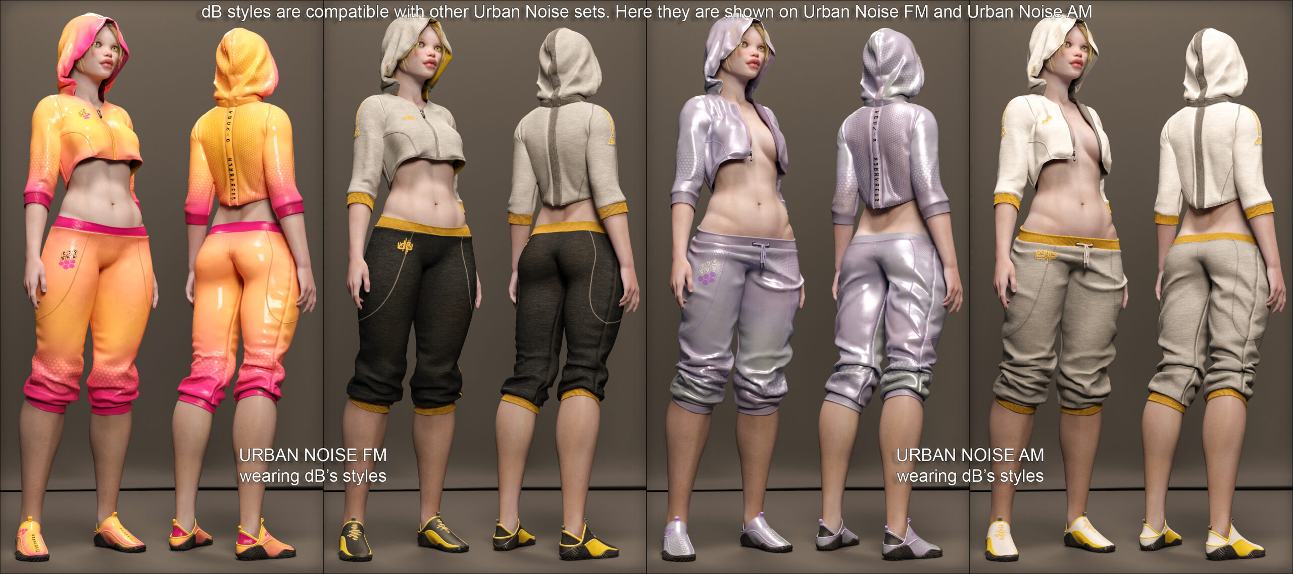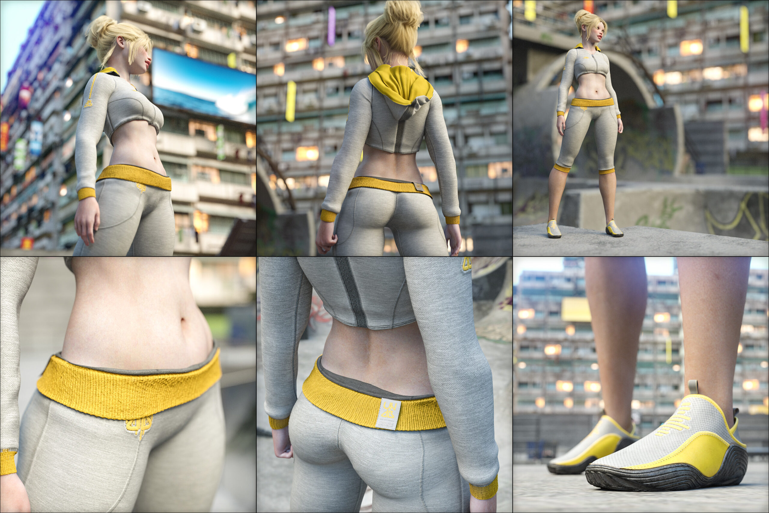 Urban Noise dB includes a stylish Short Hoodie with long sleeves, 3/4 comfy Pants with their waistband folded out and barefoot Shoes. It includes both Genesis 8 female and Genesis 9 versions.