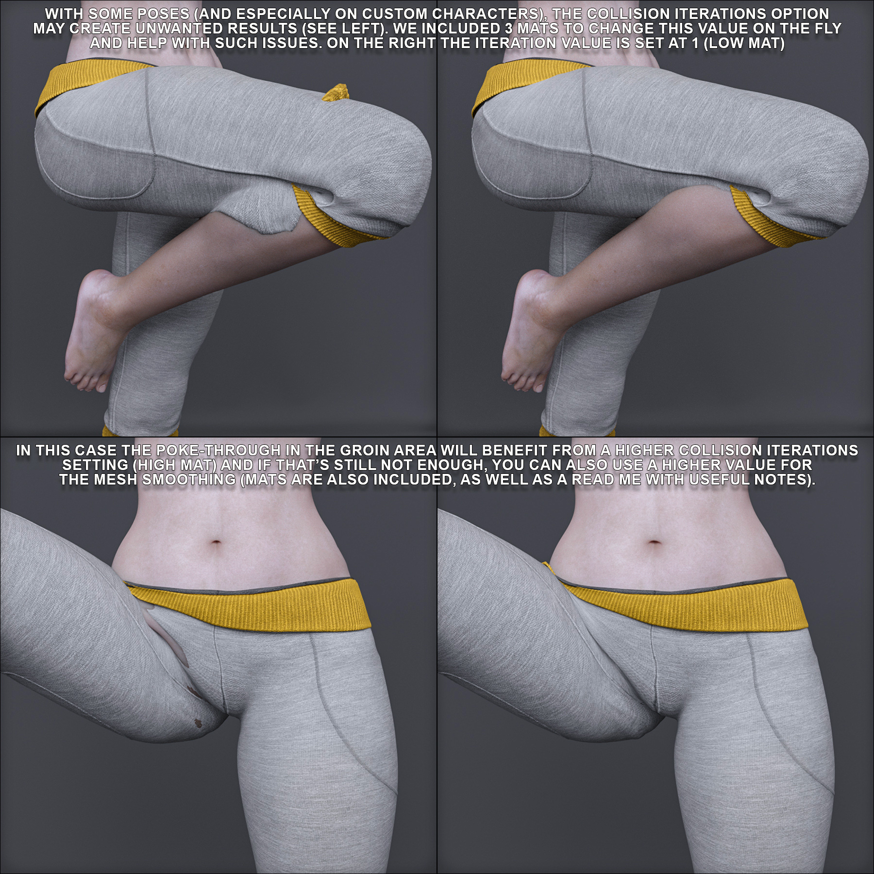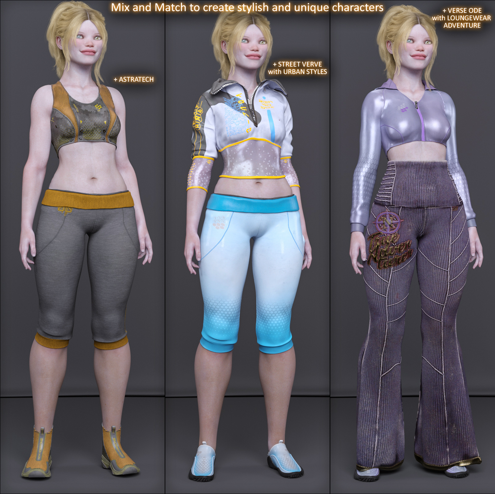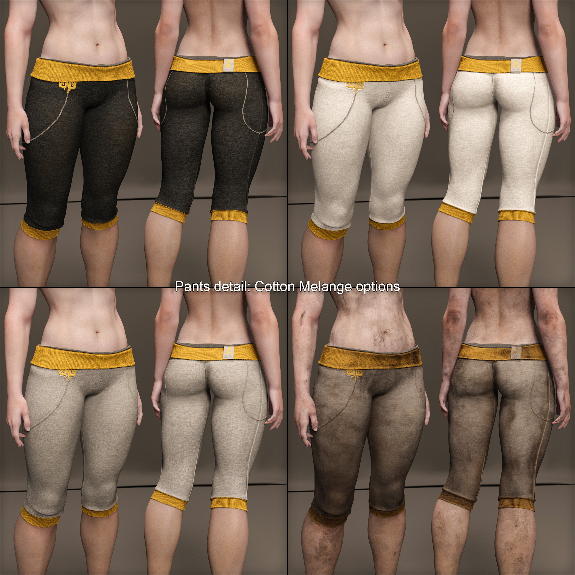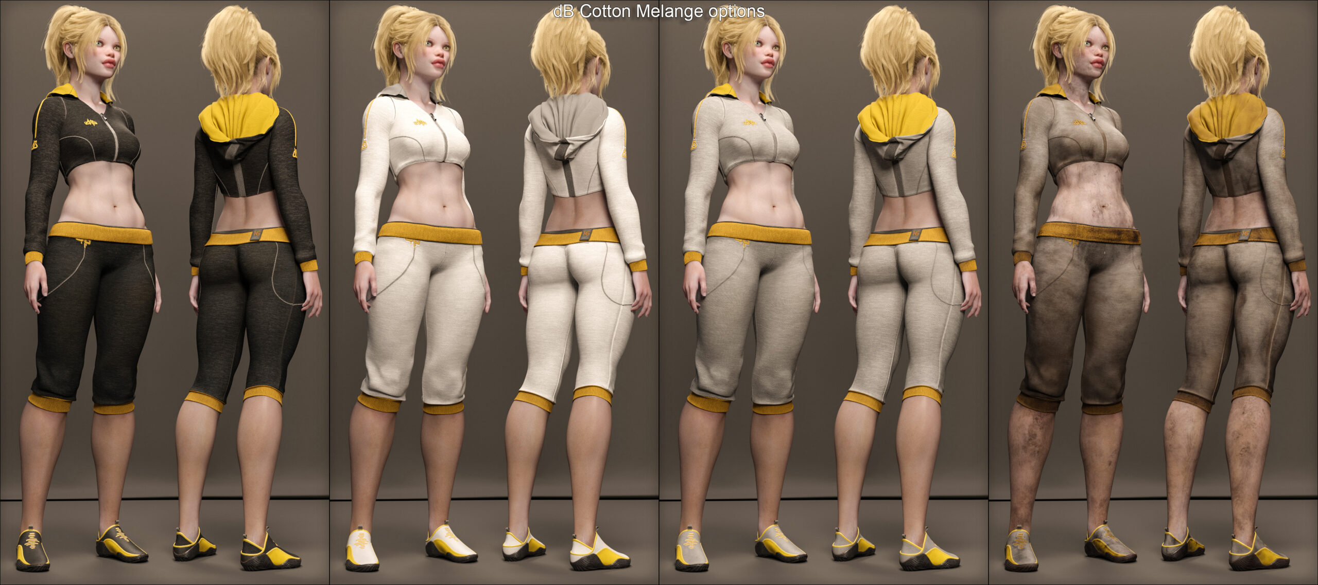 Urban Noise dB includes a stylish Short Hoodie with long sleeves, 3/4 comfy Pants with their waistband folded out and barefoot Shoes. It includes both Genesis 8 female and Genesis 9 versions.