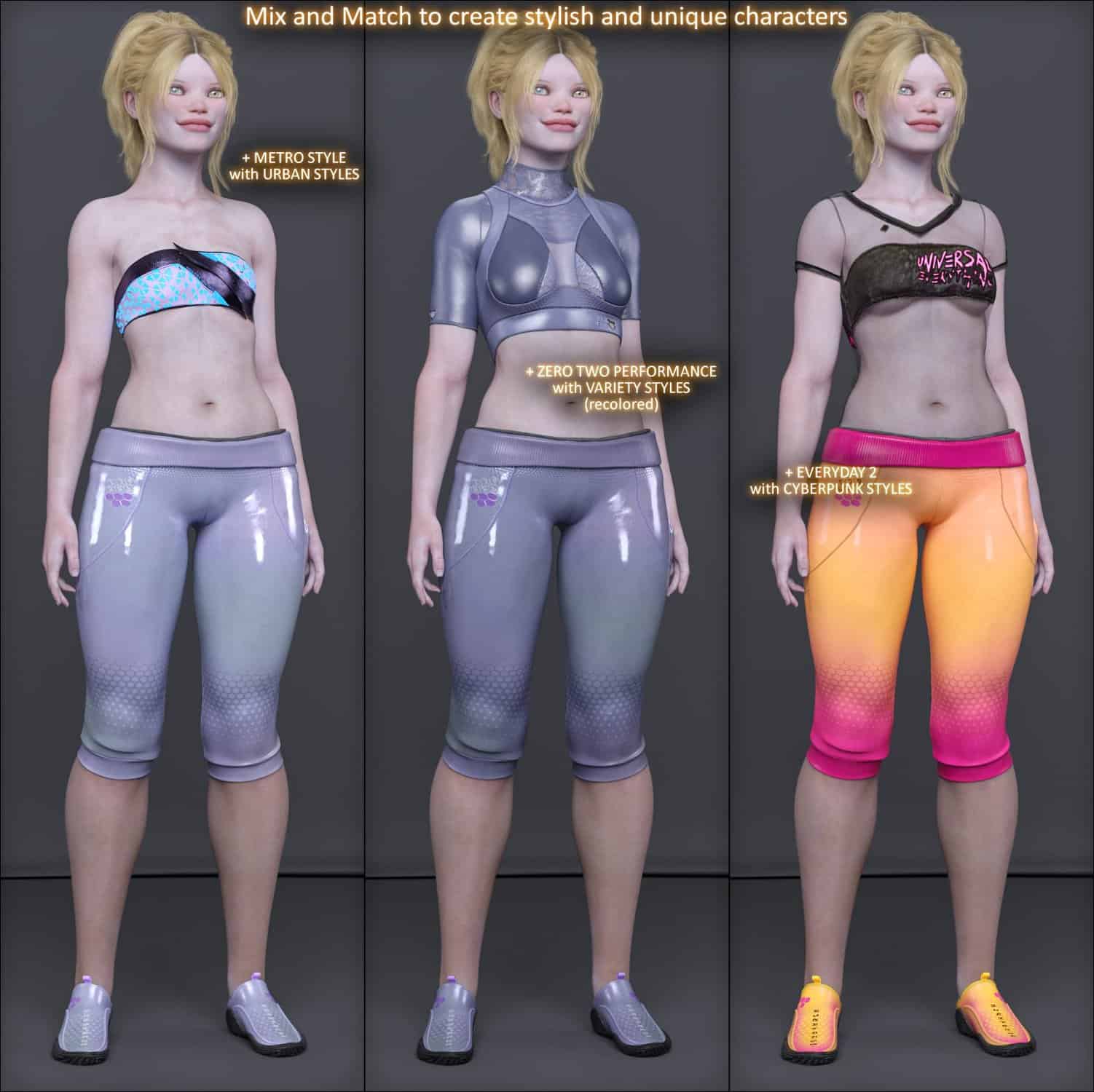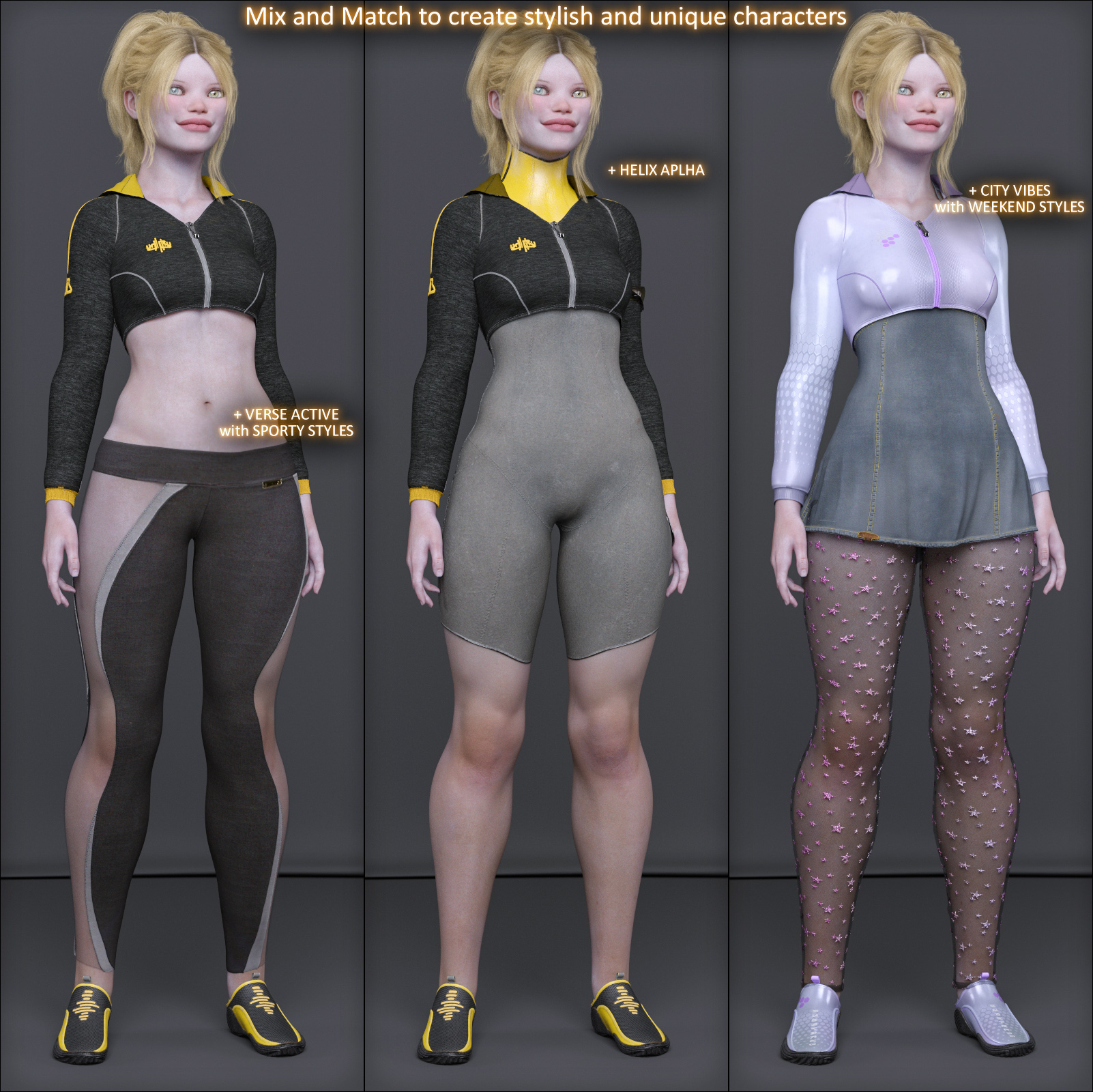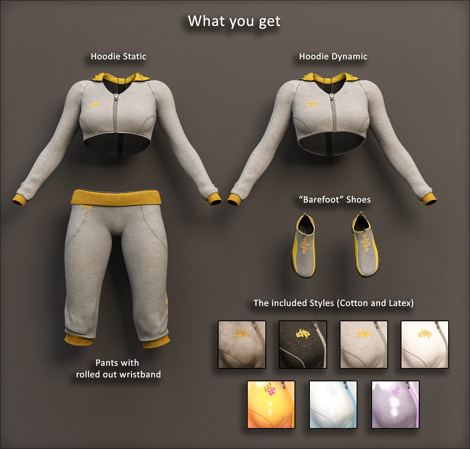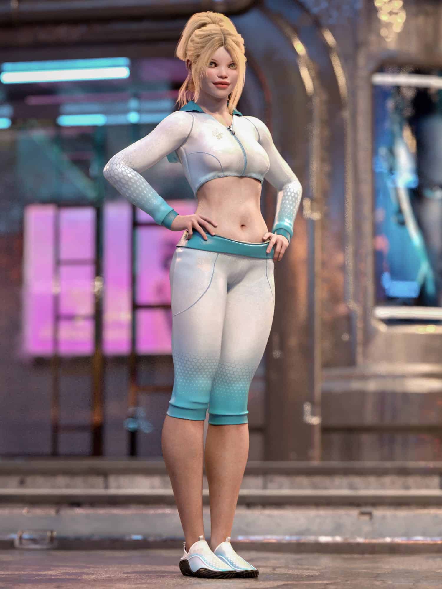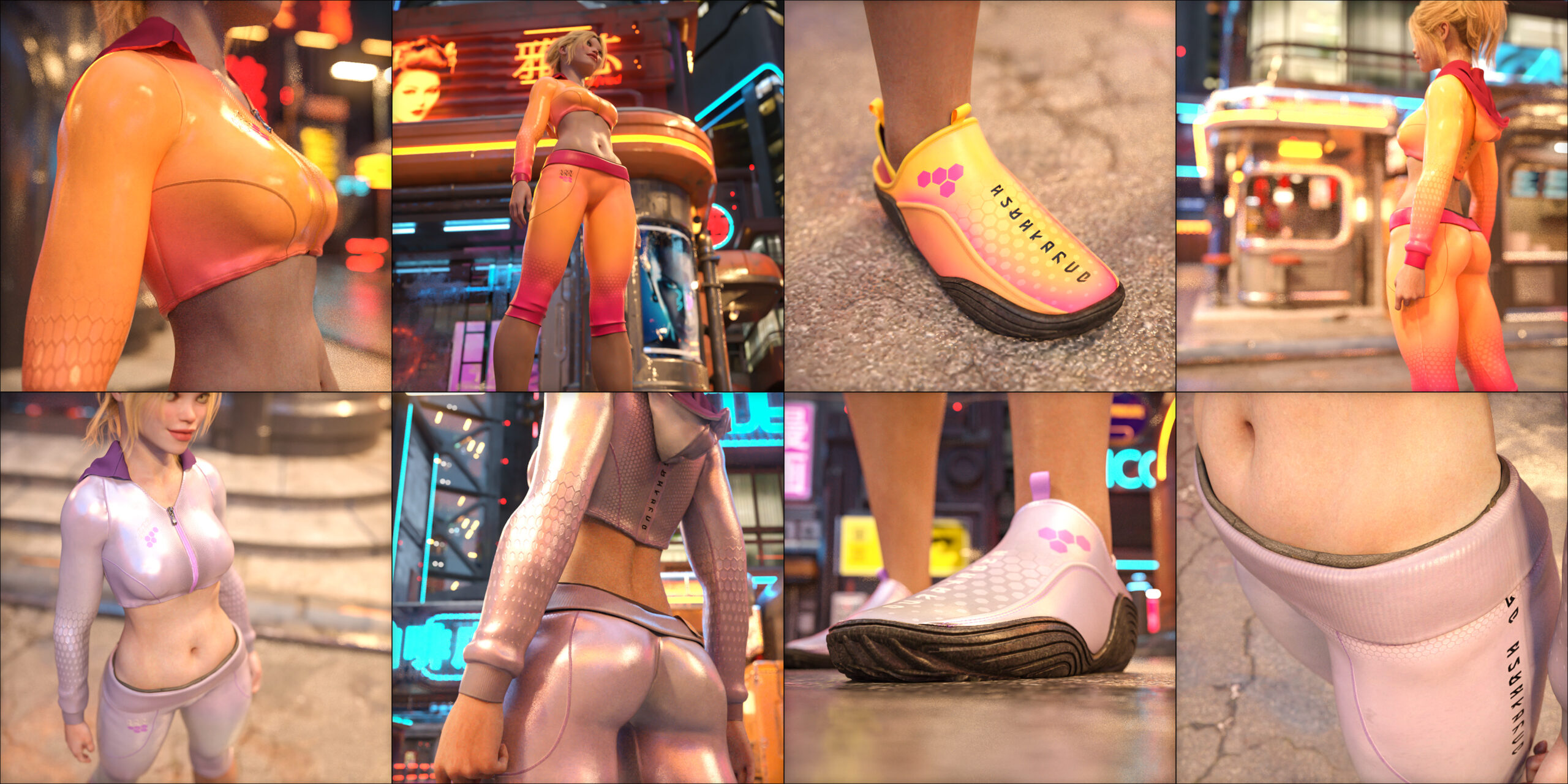 Urban Noise dB includes a stylish Short Hoodie with long sleeves, 3/4 comfy Pants with their waistband folded out and barefoot Shoes. It includes both Genesis 8 female and Genesis 9 versions.
