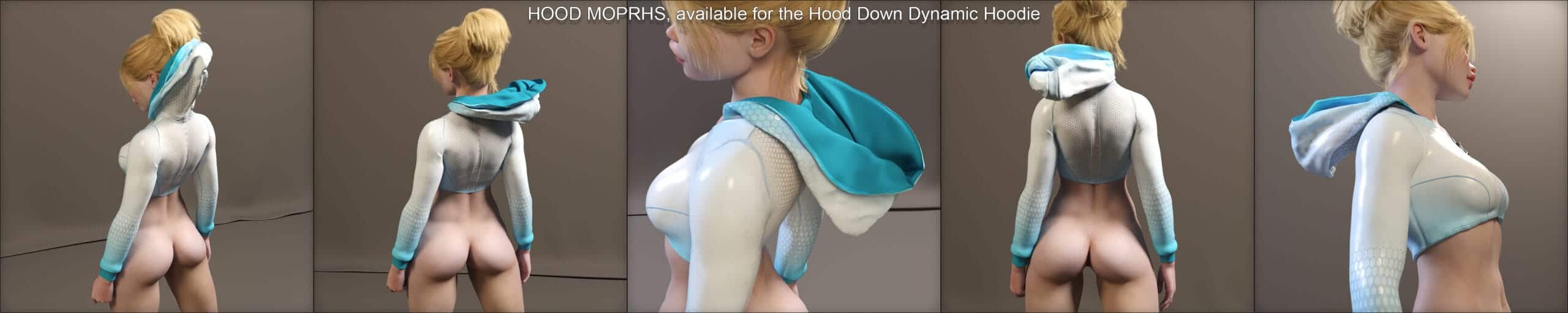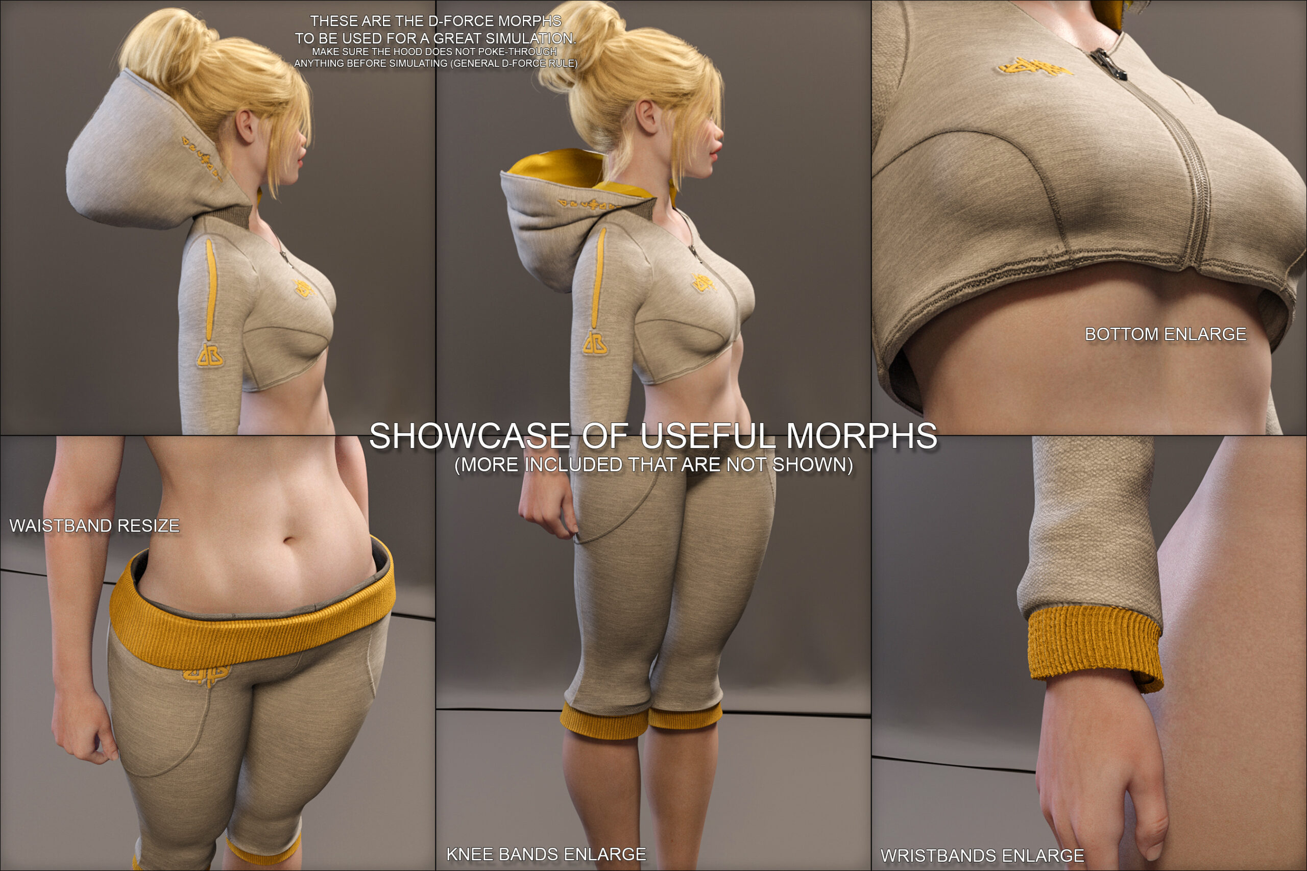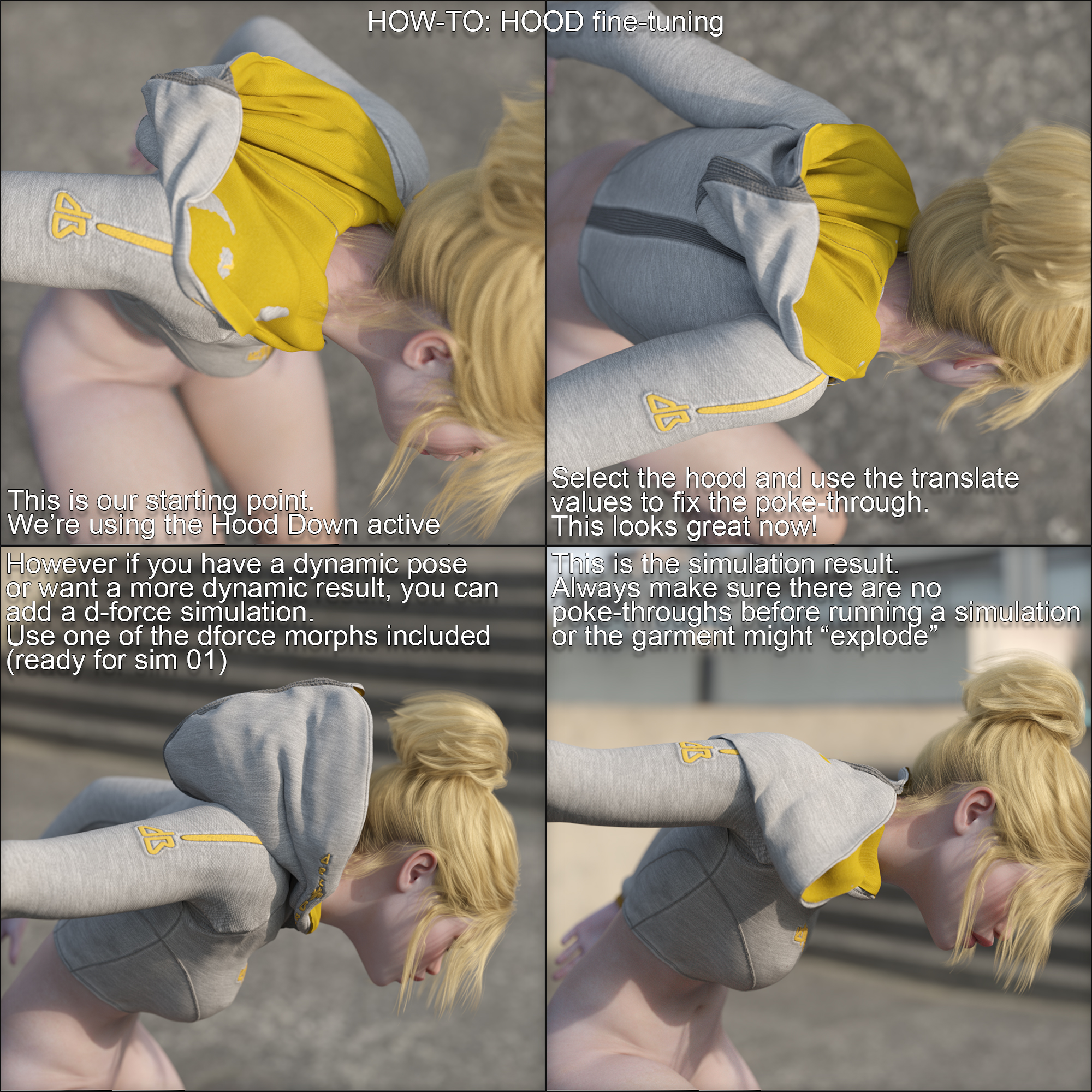 • Hood movement morphs and dForce sim helpers for the “dynamic” hoodie