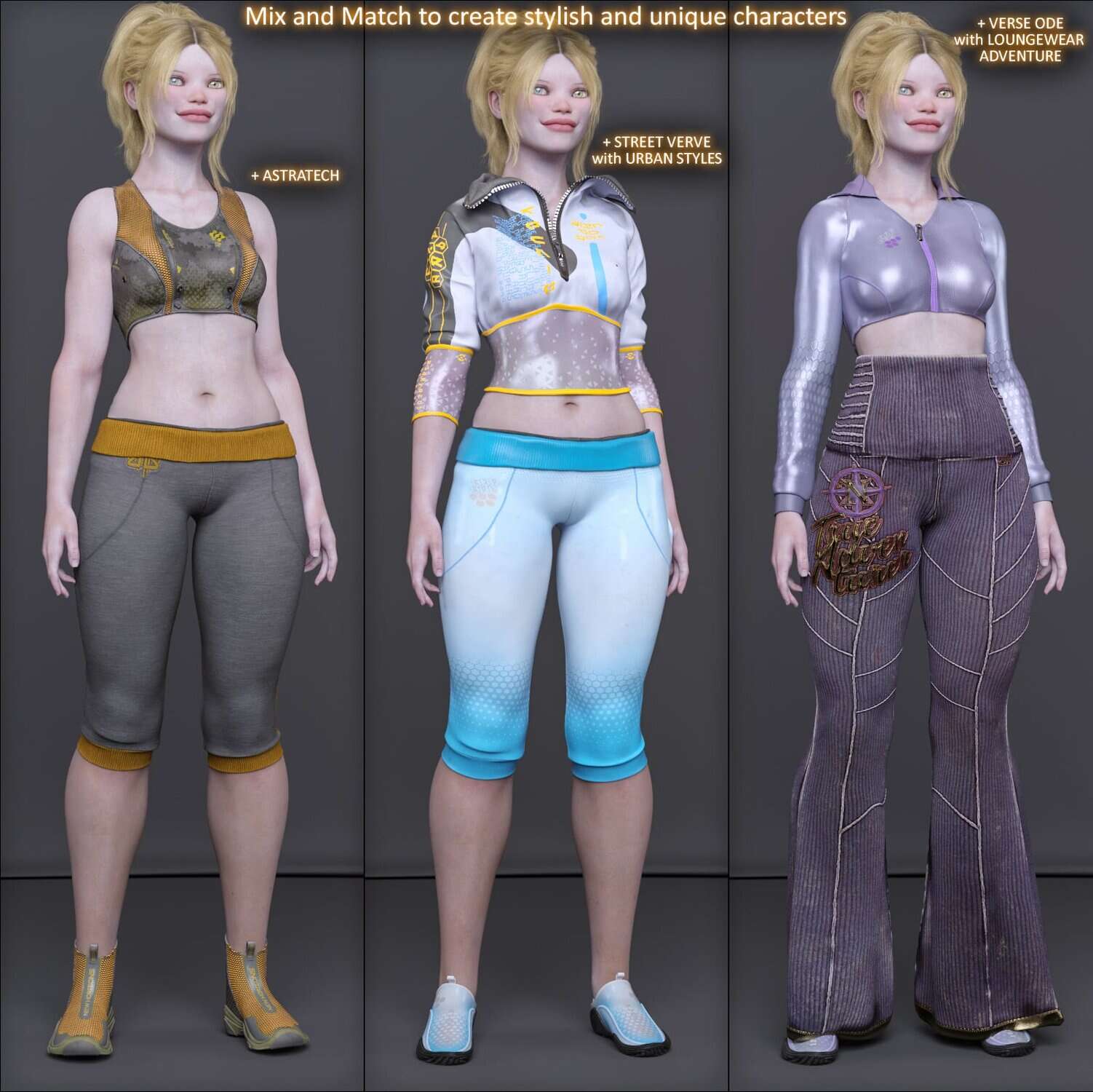 Mix and match pieces from all different outfits to create a more unique look and use any texture on any clothing piece as they are all compatible, including the add-ons.
