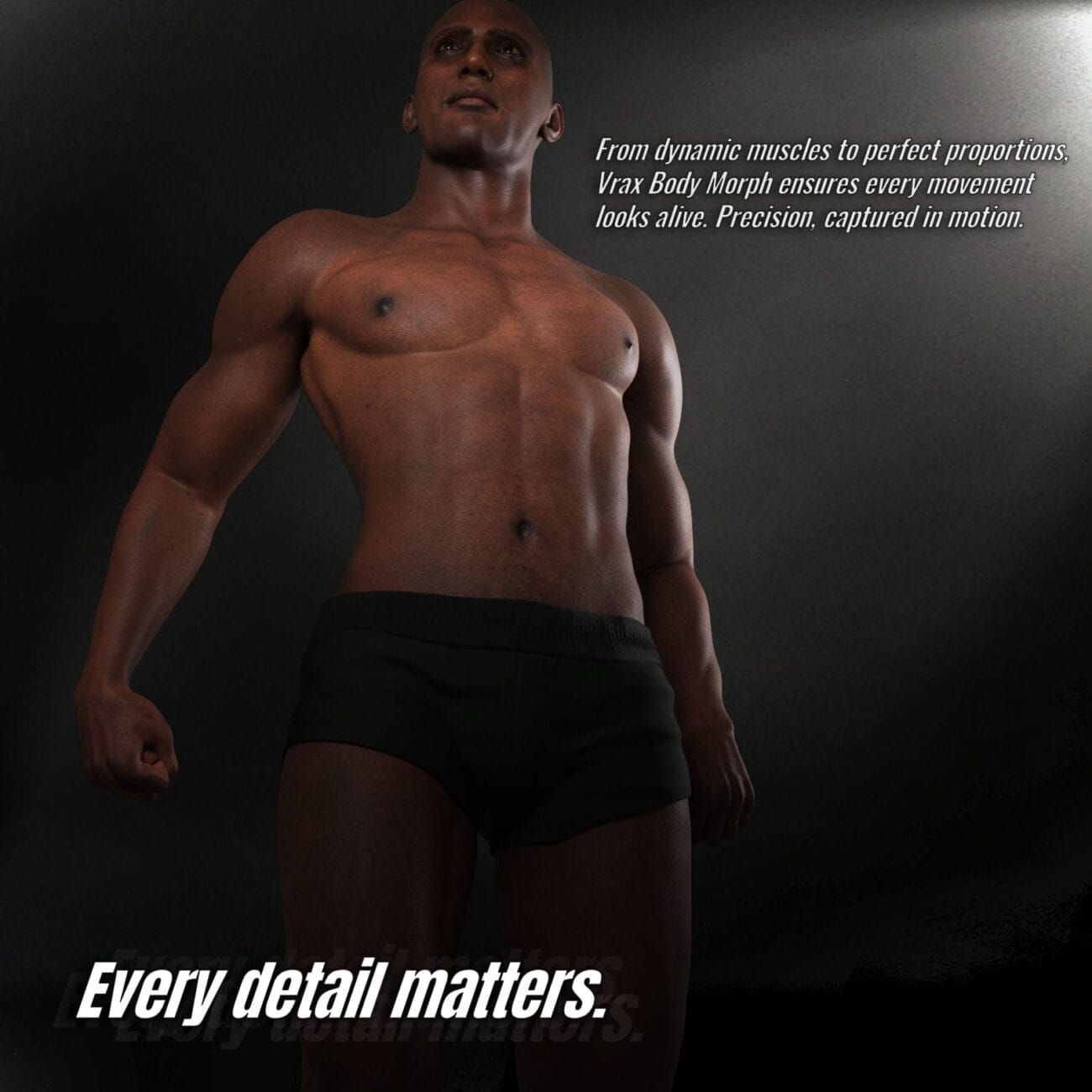 Realistic Proportions – The Vrax morphs are crafted to reflect true-to-life anatomy, with balanced muscle groups and a refined masculine physique. Adjustments to hands and feet provide an authentic and polished final look.