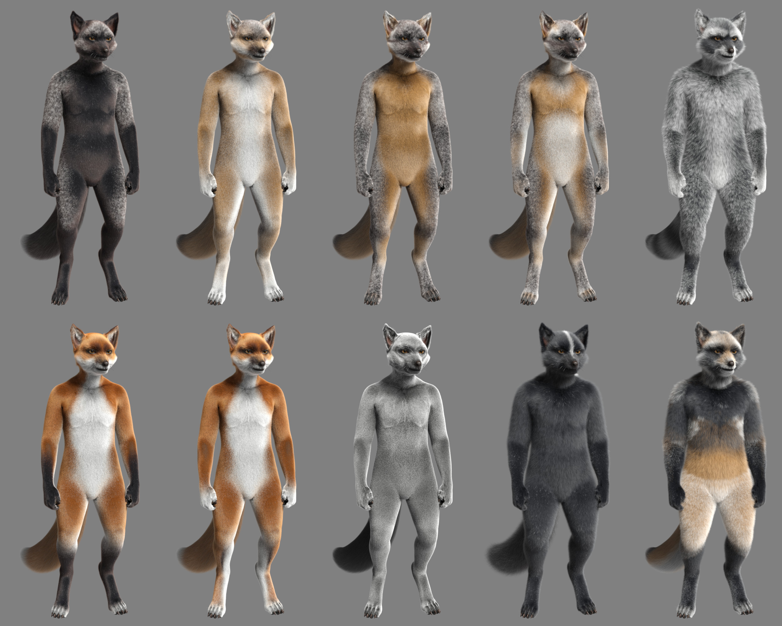 Fur styles: Black Fox, Desert Fox, Gray Fox (2 varieties), Red Fox (2 varieties), Simple Fur (regular and Fluffy), Raccoon, Skunk, and Tanuki.