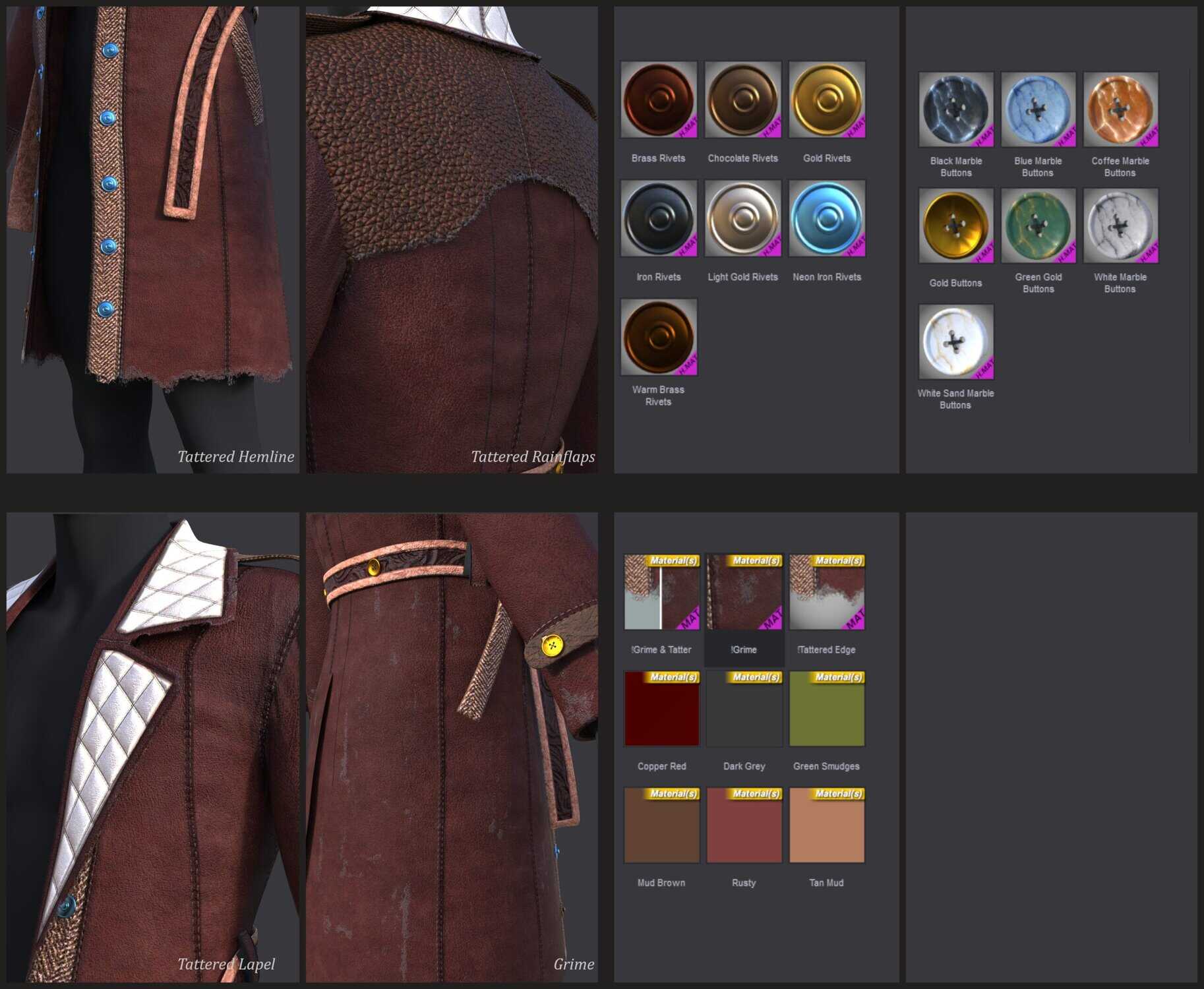 6 Grime and Tattered Top Coat quick-change buttons (Use the Topcoat Color Setting in the Surface panel to use your own)