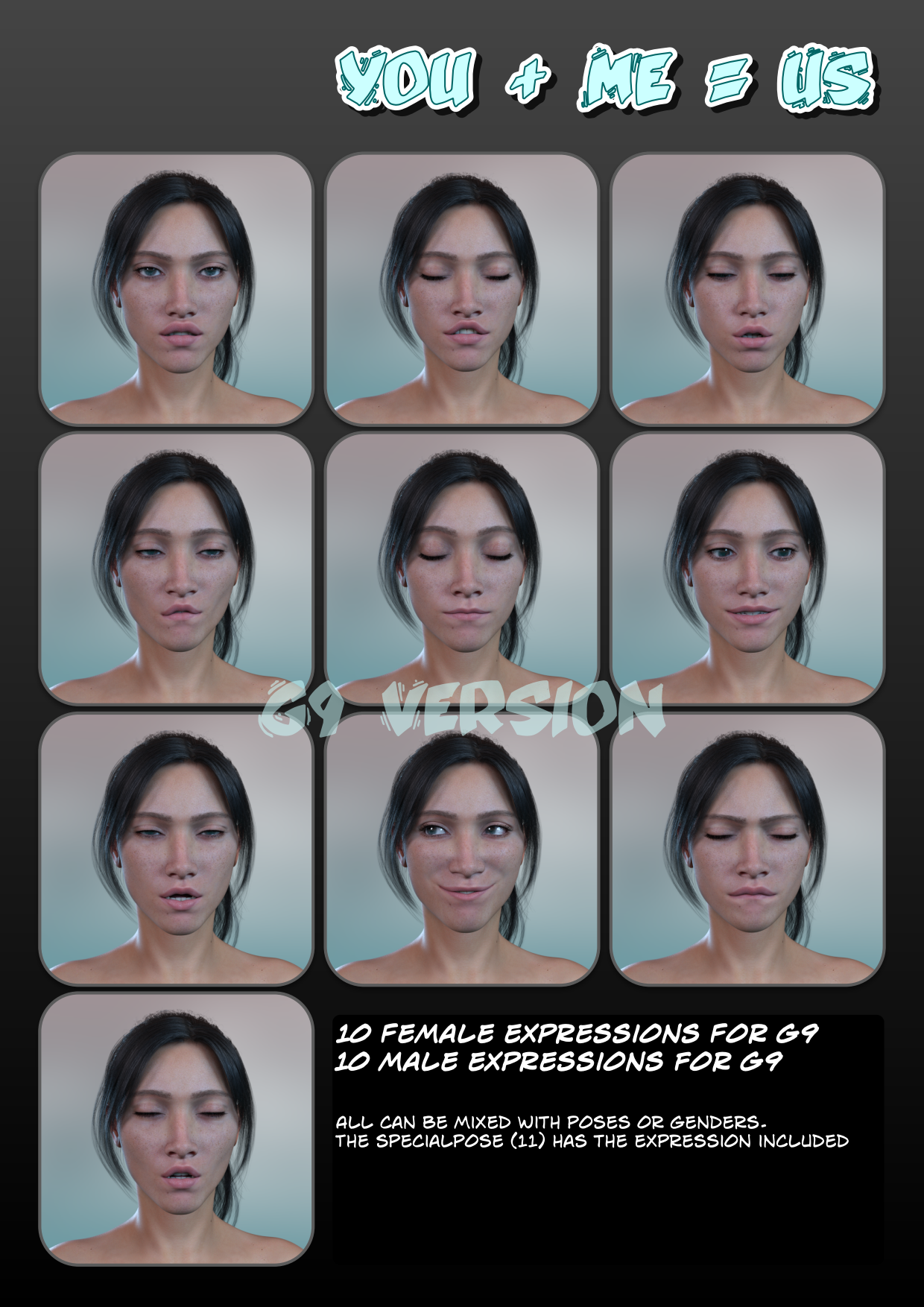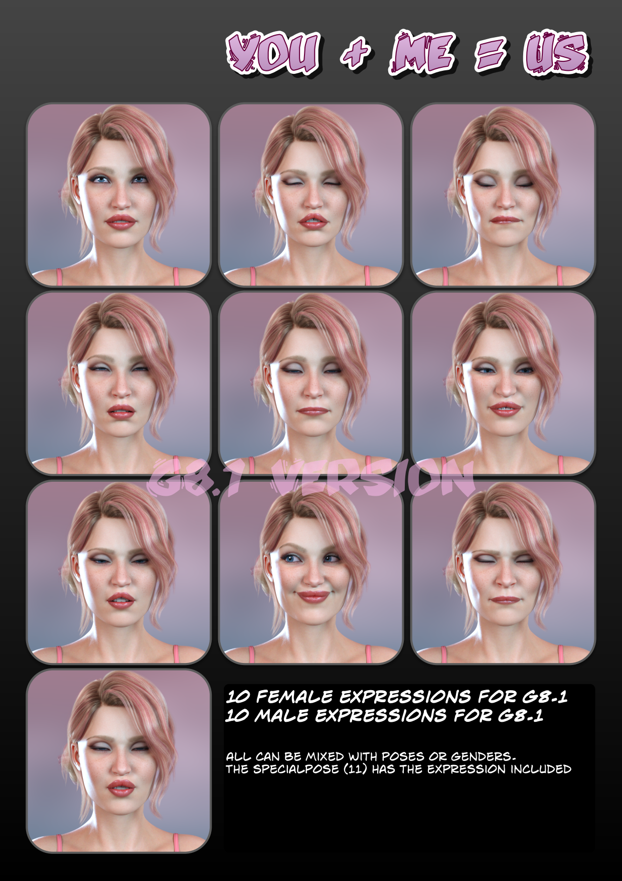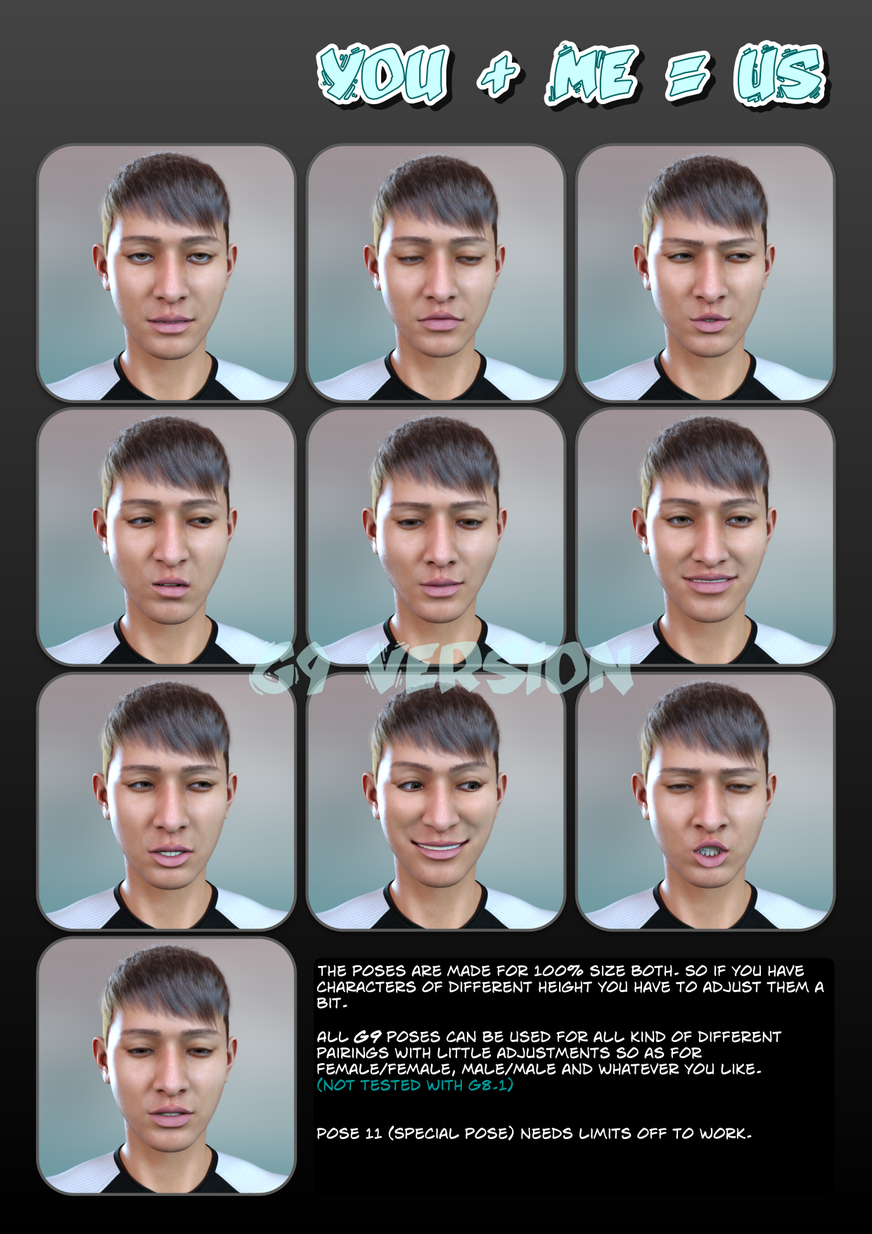 In this set you have 11 couple poses for G9 and G8 (and 8.1)plus 22 expressions for each.