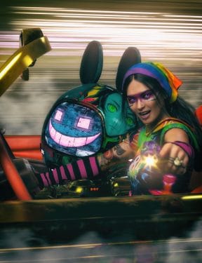Futuristic cyberpunk woman in neon-lit lounge with bold fashion, latex gloves, striped stockings, and vibrant lighting.