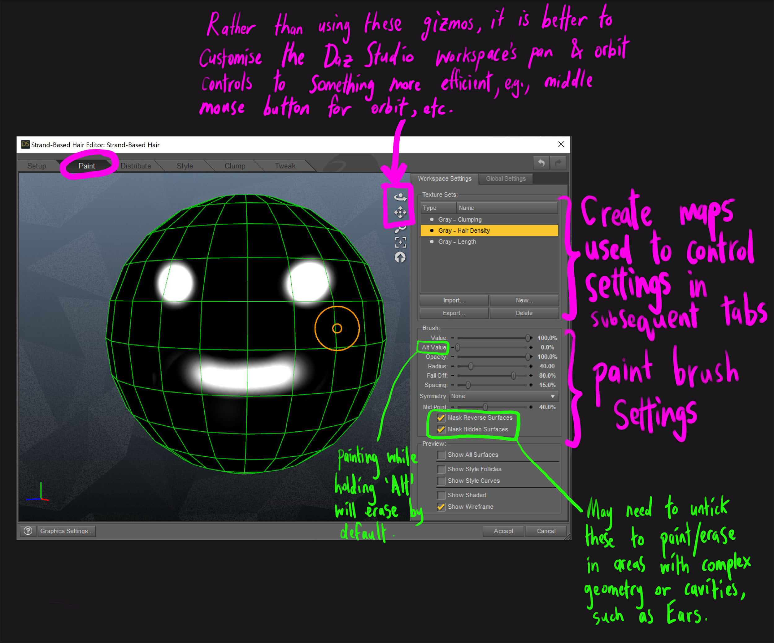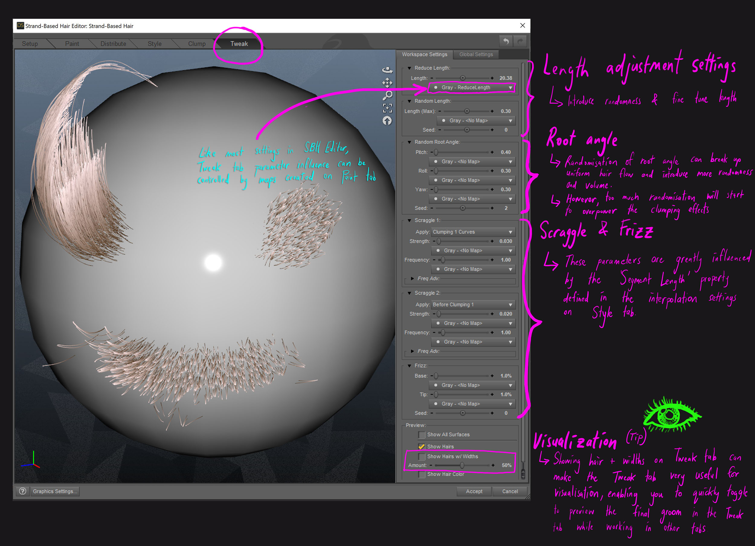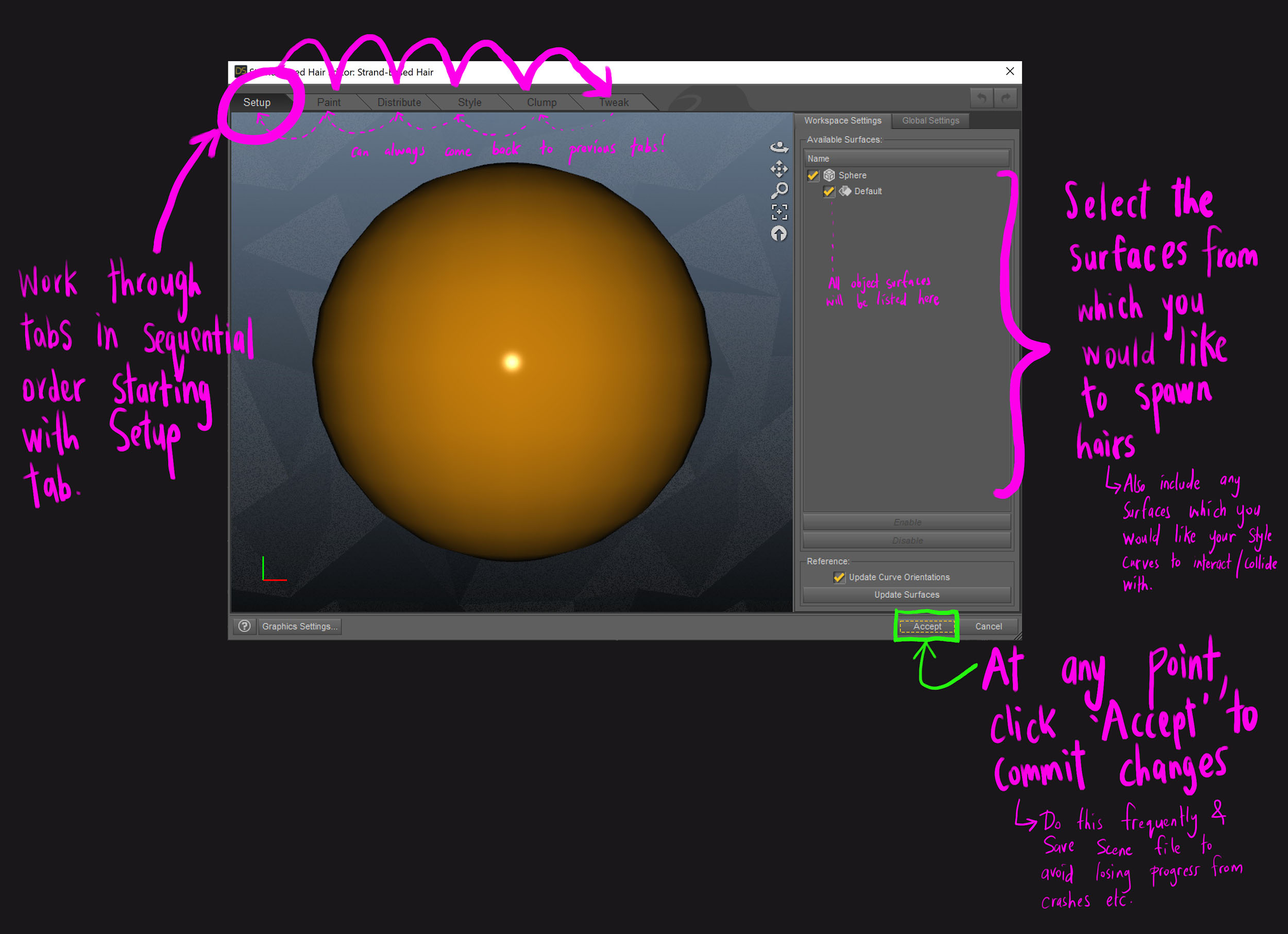 Tip: Remember to “save” intermittently. This can be done by clicking ‘Accept’ and then saving the Scene file. You can resume editing SBH under Edit>Object>Strand-Based Hair